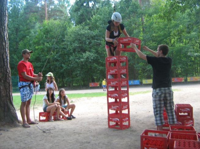 Aktywne Wakacje pokonywały dzisiaj swoje lęki przed wysokościami. Cała grupa spisała się na medal, ponieważ wszyscy weszli na wieże ze skrzynek, którą sami oczywiście dzielnie układali. Najwięcej ułożył Dawid - aż 17. Gratulujemy:)