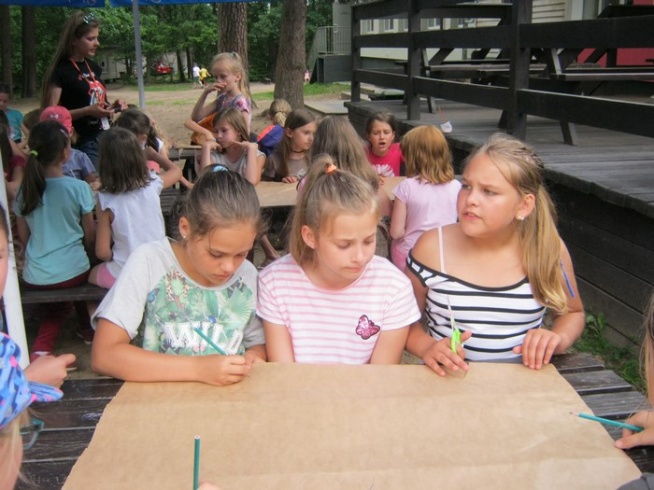 Dzisiaj kolejny dzień, kiedy pogoda nam dopisała, dlatego większość czasu spędziłyśmy na dworze. Rano grałyśmy w ringo i byłyśmy na plaży, gdzie kąpałyśmy się i grałyśmy w double. Po plażowaniu miałyśmy karaoke i śpiewałyśmy super piosenki. Po obiedzie robiłyśmy bańki XXL, były ogromne! Potem zrobiłyśmy piękne bransoletki, które zachowamy na pamiątkę z kolonii. Wieczorem grałyśmy w taboo – było bardzo śmiesznie.