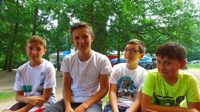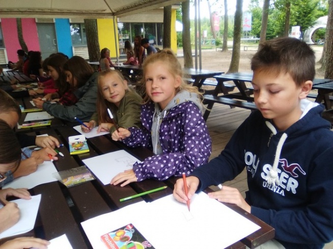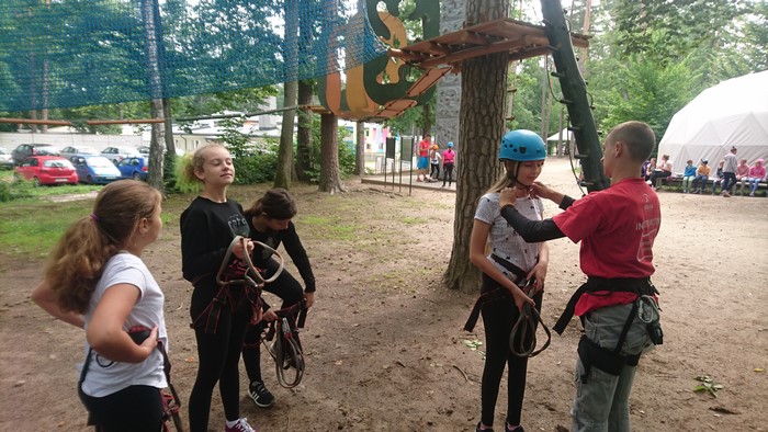 Dzisiaj najbardziej podobał nam się waterball. Zamknięci w kuli unosiliśmy się na wodzie. Później bawiliśmy się w Pif-Paf, a potem braliśmy udział w konkursie plastycznym. Po obiedzie cała grupa udała się na zajęcia linowe, podczas których staraliśmy się ułożyć największą wieżę ze skrzynek, na którą należało się wspiąć. Wieczorem pływaliśmy kajakami po jeziorze Łęsk.