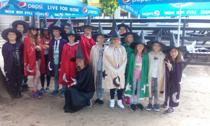 Po śniadaniu poszliśmy do lasu, a tam zbieraliśmy patyki, aby stworzyć miotłę – Nimbus 2017. Ozdabialiśmy ją kolorowymi wstążkami i sznurkami. Następnie rozwiązywaliśmy zagadki z Minerwą McGonagall, za które otrzymywaliśmy punkty. Szukaliśmy również skarbów przy pomocy wykrywacza metalu. Po obiedzie czytaliśmy fragmenty Harrego Pottera. Dzień pełen atrakcji zakończyliśmy dyskoteką.