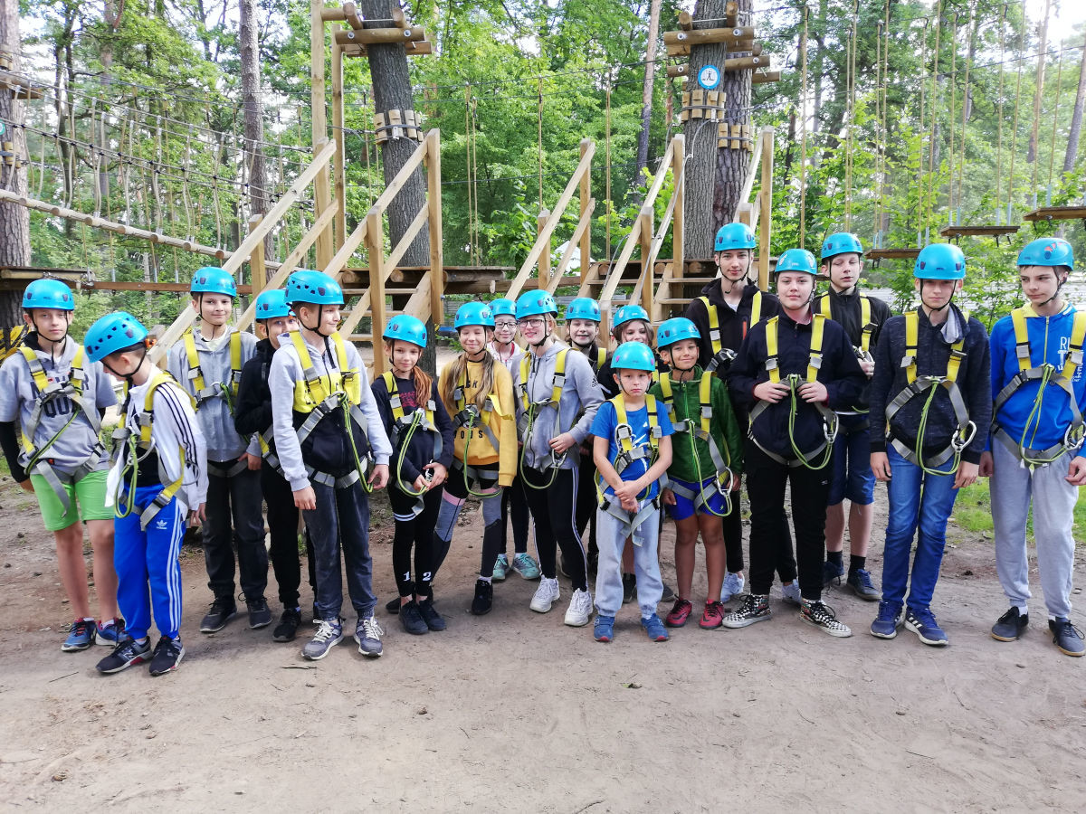 Dzisiaj rozpoczęliśmy od wspólnych gier i zabaw. Grając w Mafię wcieliliśmy się w detektywów i rozwiązywaliśmy zagadki kryminalne. Następnie rozegraliśmy turniej dwóch ogni. Kolejnym punktem dnia był survival w okolicy ośrodka. Dowiedzieliśmy się o podstawach survivalu oraz mieliśmy możliwość budowania własnego szałasu z pałatek. Po obiedzie udaliśmy się na park linowy, na którym walczyliśmy o immunitet. Nasz dzień zakończył się karaoke, na którym świetnie się bawiliśmy. To był dzień pełen wrażeń!