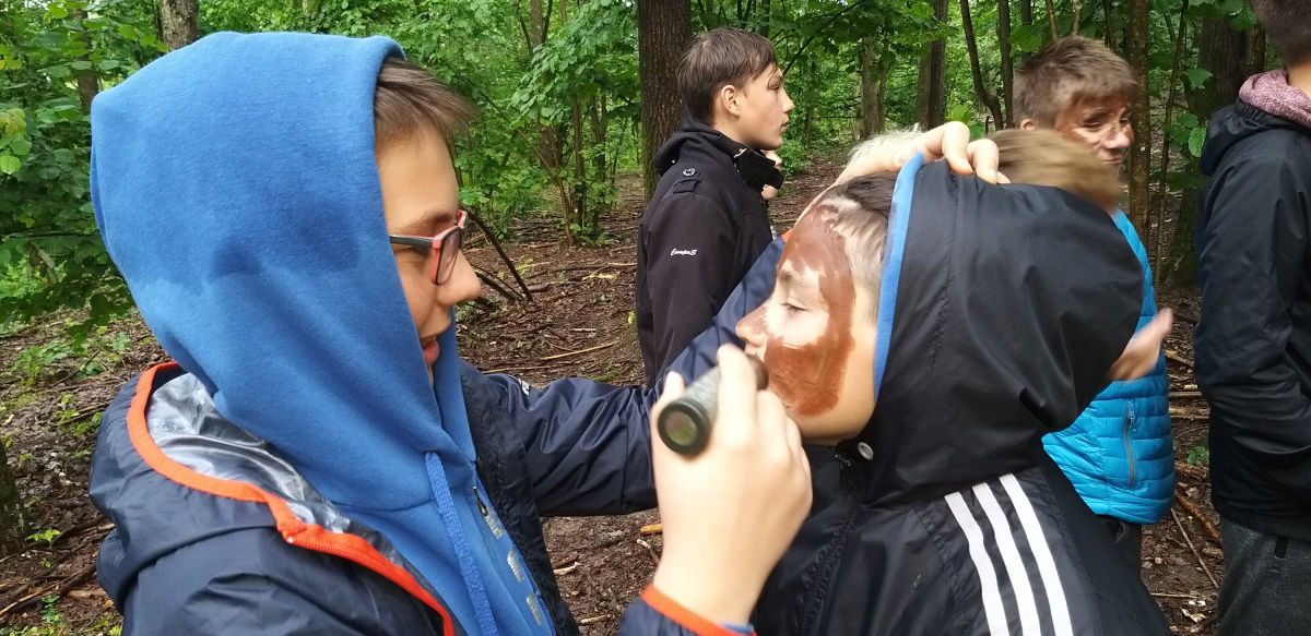 Dzisiaj rozpoczęliśmy lekcją survivalu. Instruktor pokazał nam jak filtrować wodę i rozpalać ognisko. Następnie graliśmy całą grupą w Mafię. Dziś również rozegraliśmy mecz paintballowy. Po obiedzie odbyły się zajęcia taktyki i strategii, na których poznaliśmy różne komendy i ustawienia grupy. Po kolacji wyruszyliśmy do lasu na misje Tropami Wodza.