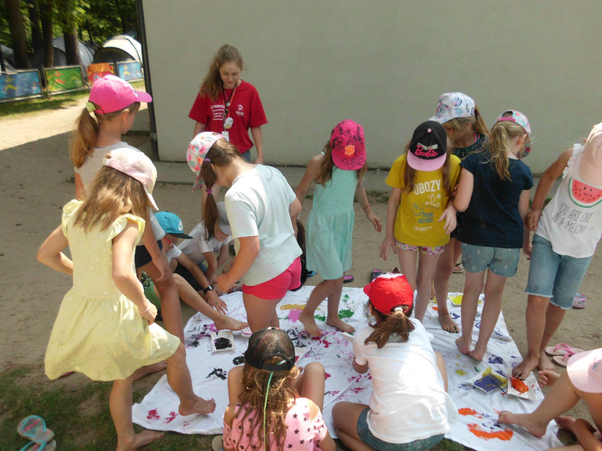 Dzisiaj z samego rana poszliśmy nad jezioro szlifować swój warsztat pływacki. Później malowaliśmy po prześcieradle nie używając rąk. Malowaliśmy stopami, kolanami, a niektórzy z nas nosami. Następnie graliśmy w leśne podchody. Dzisiaj była również olimpiada sportowa. Zmagaliśmy się w przeciąganiu liny, rzutach do celu i wyścigach z piłką. Dzień zakończyliśmy dyskoteką.
