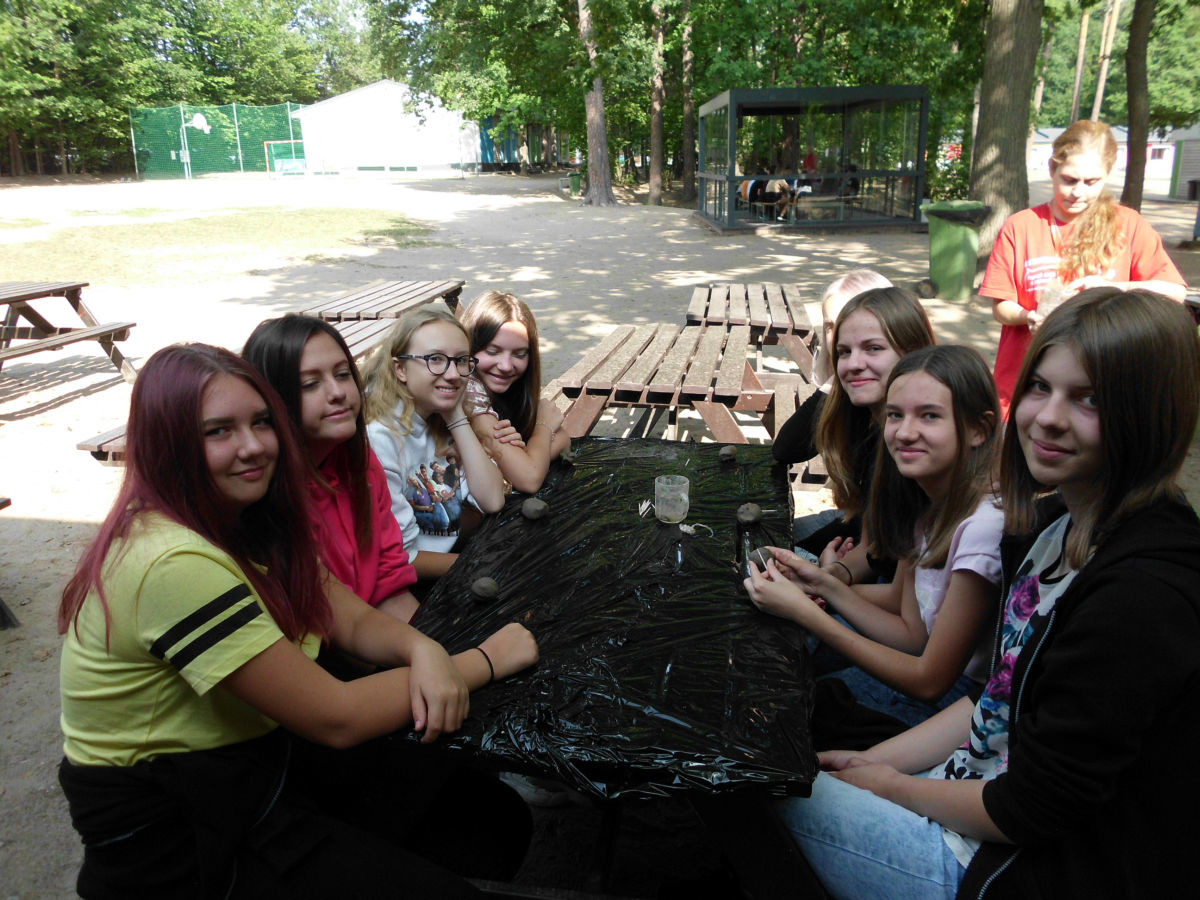 Dzień rozpoczęliśmy od porannego budzika. Następnie udaliśmy się na pyszne śniadanie, a po nim mieliśmy konkurs strzelania z wiatrówki. Odwiedziliśmy dziś również plażę. Odbyła się także rozgrywka frisbee. Po obiedzie udaliśmy się na wyprawę kajakami turystycznymi po malowniczym jeziorze Łęsk. Graliśmy dziś w mega gry. Na koniec dnia odbyła się dyskoteka z zaprzyjaźnionymi grupami.