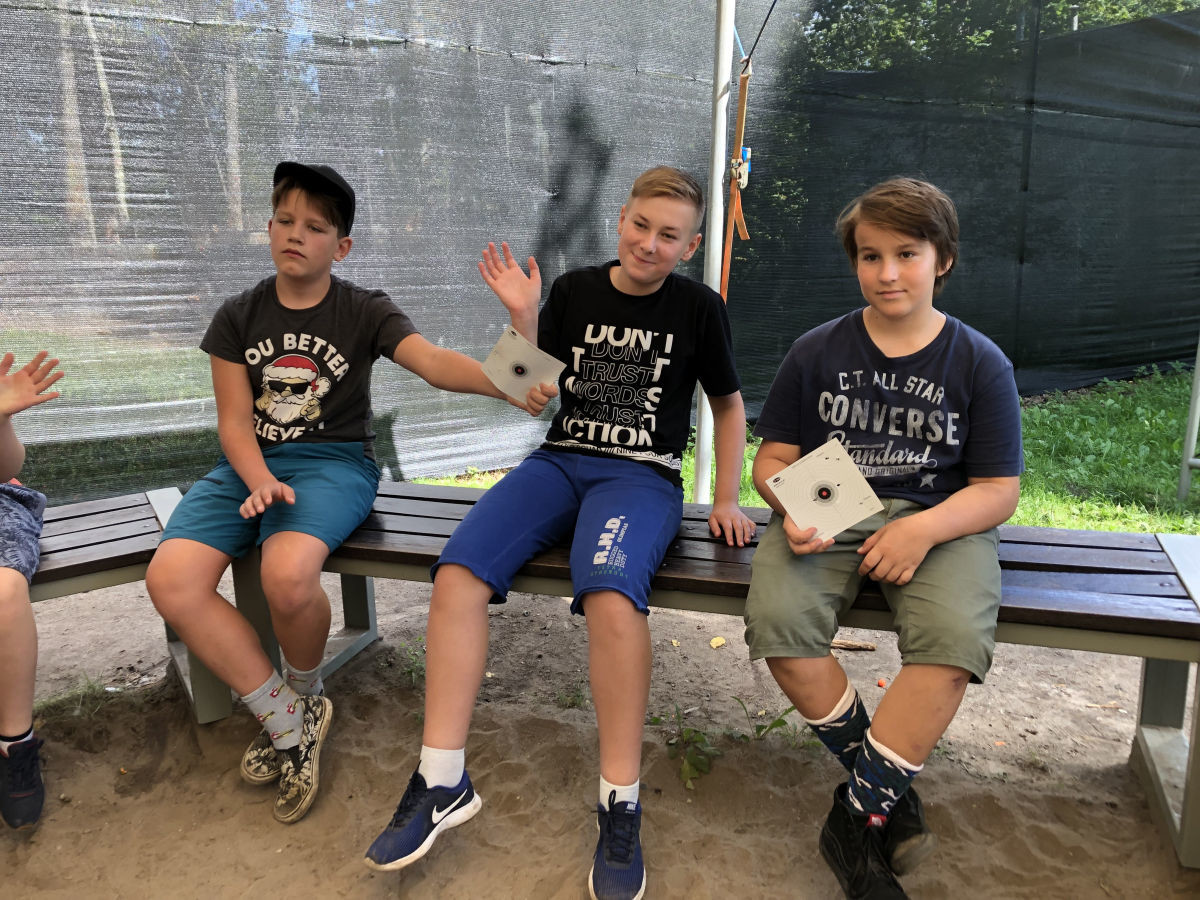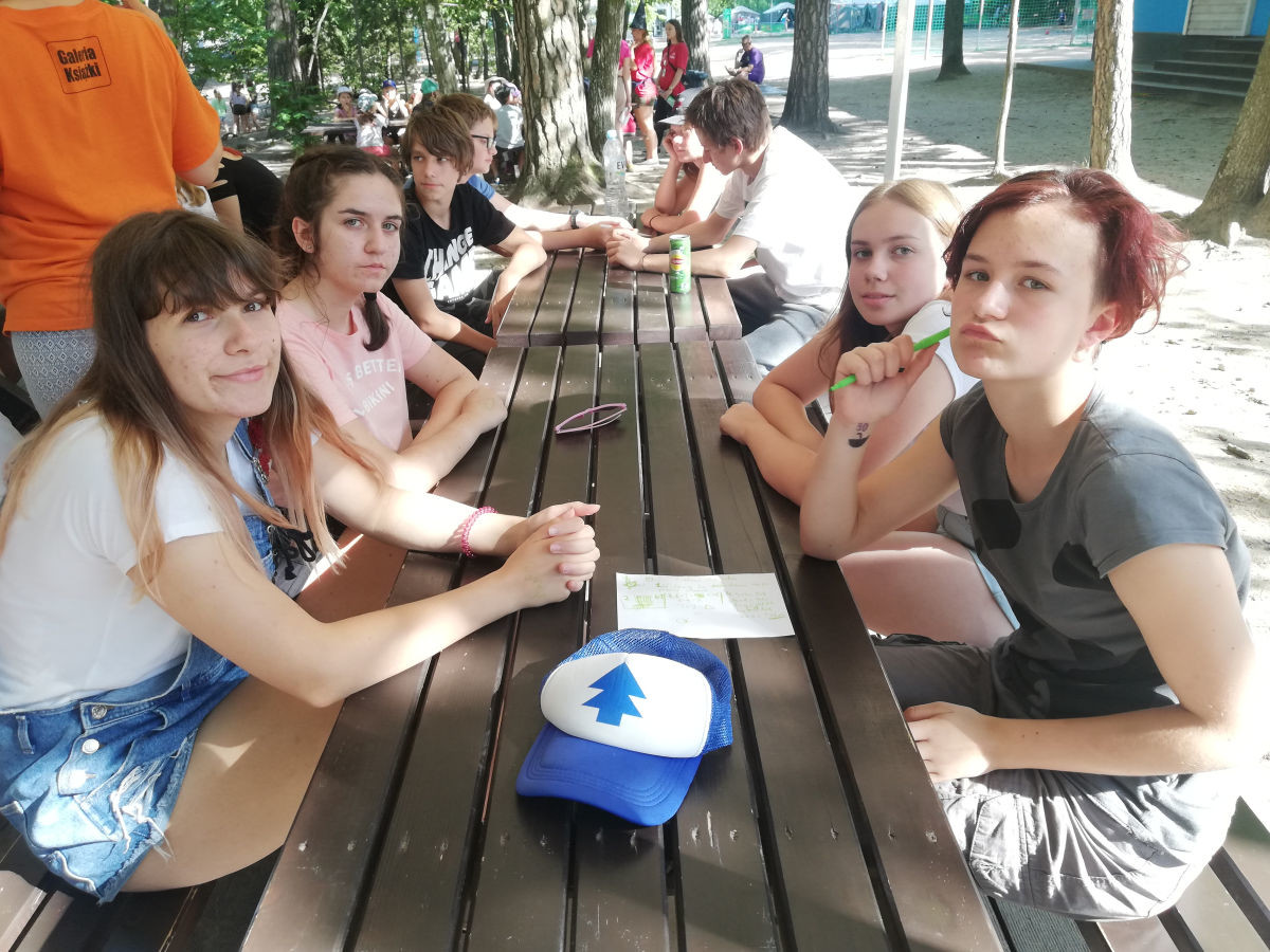 Słoneczny dzień rozpoczęliśmy od gry terenowej Błędny Azymut, w trakcie gry uczyliśmy się używać kompasów, a korzystanie z nich ułatwiło nam rozwiązać zagadkę. Skrzynki to była świetna zabawa, która wymagała skupienia. Dzięki słonecznej pogodzie korzystaliśmy z kulkowej plaży, na której kąpaliśmy się i plażowaliśmy. Po obiedzie robiliśmy swoje oryginalne przypinki, wieczorem zagraliśmy mecz korfballu.