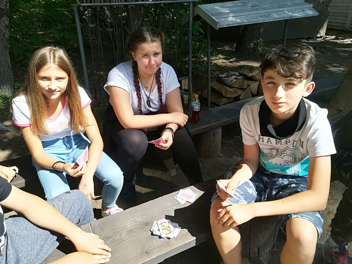 Dzień rozpoczęliśmy od warsztatów teatralnych, na których tworzyliśmy swój spektakl. Następnie uczyliśmy się rozpalać ogień i tworzyć filtry do uzdatniania wody. Doskonalenie technik pływackich pozwoliło nam się ochłodzić w ten upalny dzień. Po pysznym obiedzie musieliśmy wytężyć nasze umysły w zagadkach logicznych. Tatuaże z henny sprawiły nam wiele zabawy. Wieczorem uczyliśmy się szyfrowania z Hermesem.