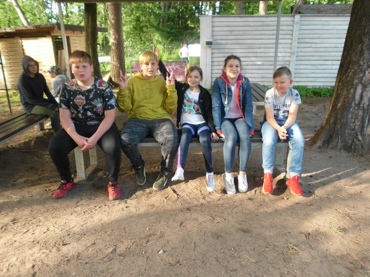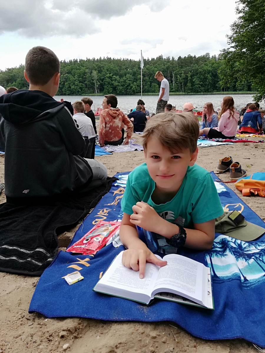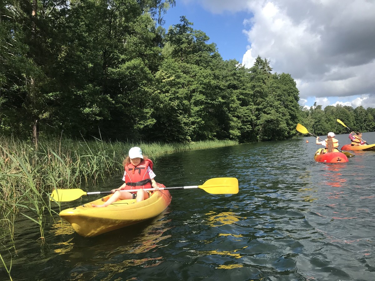 Po pysznym śniadaniu graliśmy w gry zespołowe. Później pływaliśmy po jeziorze przy pięknym słońcu na kajakach dwuosobowych po jeziorze Łęsk. Po obiedzie graliśmy w gry świata. Następnym punktem naszego dnia była gra terenowa Enigma. Musieliśmy szyfrować wiadomości. Po kolacji puszczaliśmy bańki, było przy tym trochę rywalizacji, kto zrobi większą bańkę.
