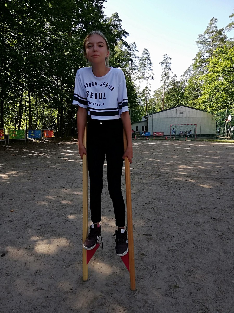 Dzień rozpoczęliśmy od robienia baniek XXL. Mieliśmy też grę terenową Tron Króla Juliana. Szukałyśmy zagadek po całym ośrodku. Wspinaliśmy się na ściankę wspinaczkową. Hania weszła na samą górę. Po obiedzie świetnie bawiliśmy się chodząc na szczudłach i jeżdżąc dziwnym rowerem. Pływaliśmy też kajakami sit on top po jeziorze Łęsk. Dzień zakończyliśmy wspólnymi grami i zabawami.