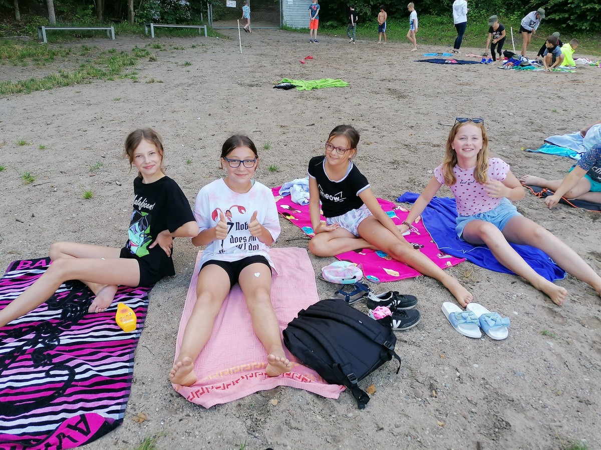 Dzisiejszy dzień zaczęliśmy od wyprawy na rowerach wodnych po jeziorze Łęsk, a następnie mieliśmy czas na plażowanie, odpoczynek i wodne zabawy. Potem odwiedziliśmy strefę, w której znajduje się eurobungee. Zabezpieczeni specjalną uprzężą mogliśmy skakać najwyżej jak umiemy, a kto z nas umiał, mógł robić salta w powietrzu. Po obiedzie pod okiem pana instruktora mieliśmy okazję nauczyć się strzelać z wiatrówki, a wieczór spędziliśmy na grze terenowej Mafia.