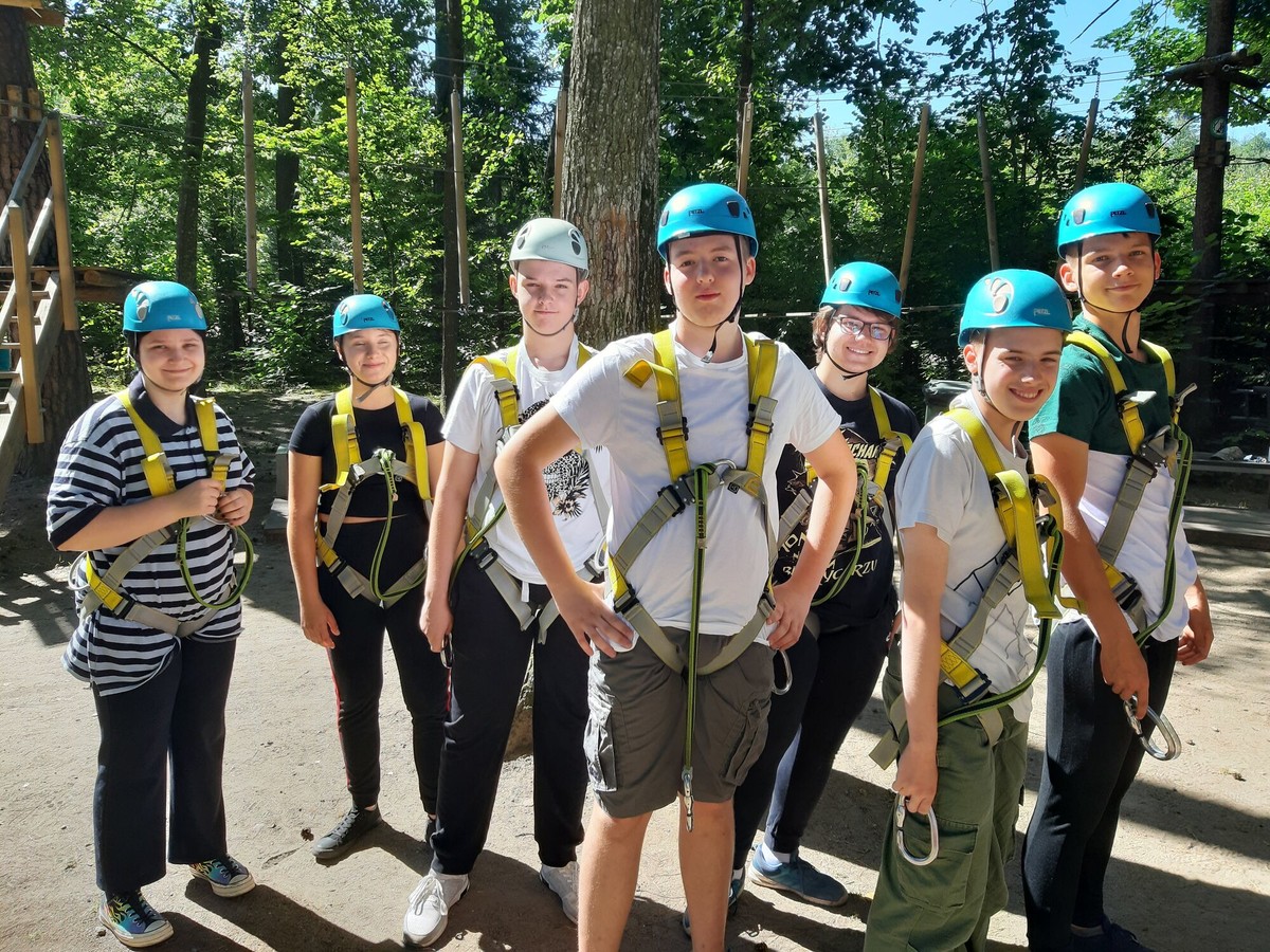 Z samego rana doskonaliliśmy umiejętności jazdy quadem. Każdy z nas przejechał aż dziesięć okrążeń! Następnie ubrani w specjalną uprząż skakaliśmy na eurobungee. Przedobiedni czas umilił nam rejs kajakami turystycznymi po jeziorze Łęsk. Z tafli wody podziwialiśmy piękny krajobraz. W dalszej części dnia strzelaliśmy do celu z wiatrówek oraz integrowaliśmy się z grupą.