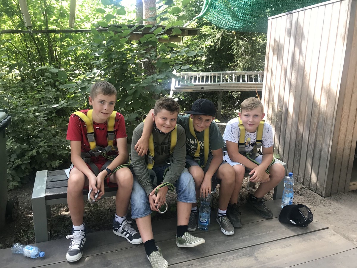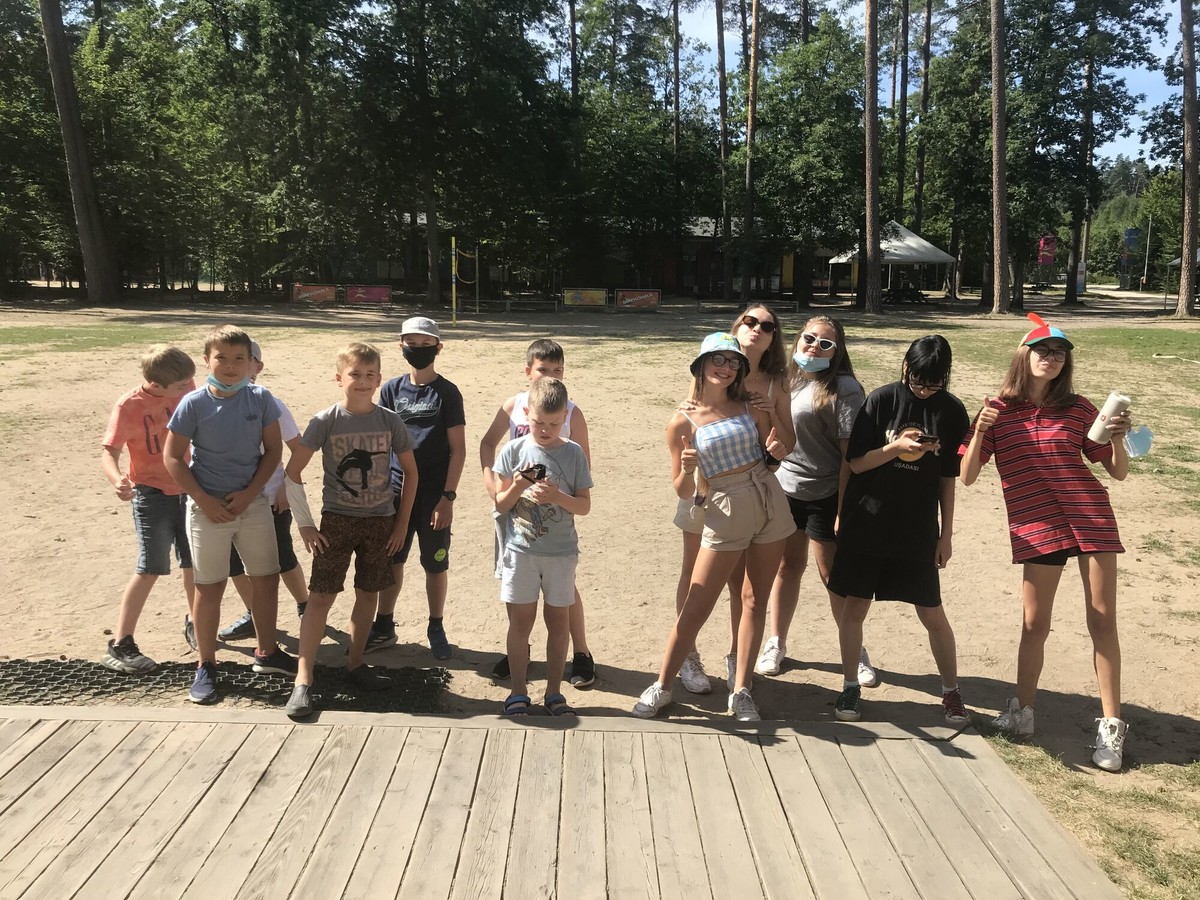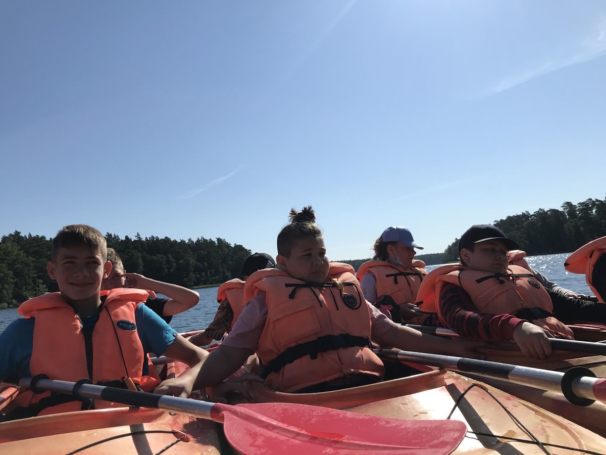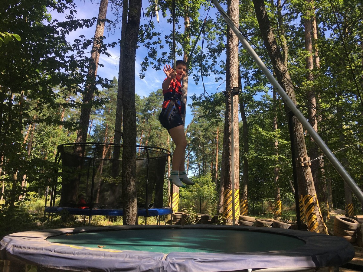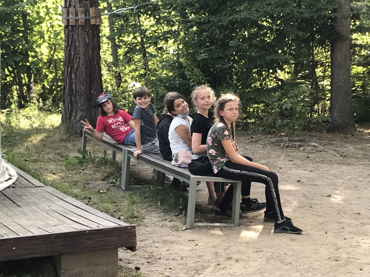 Dziś po śniadaniu udaliśmy się poskakać na eurobungee. Następnie ruszyliśmy na wycieczkę kajakami po naszym jeziorze. Po obiedzie zagraliśmy w mega gry i nauczyliśmy się jeździć dziwnym rowerem oraz chodzić na szczudłach, a wieczorem po kolacji ruszyliśmy do lasu rozwiązać zagadki nocnej Mafii.