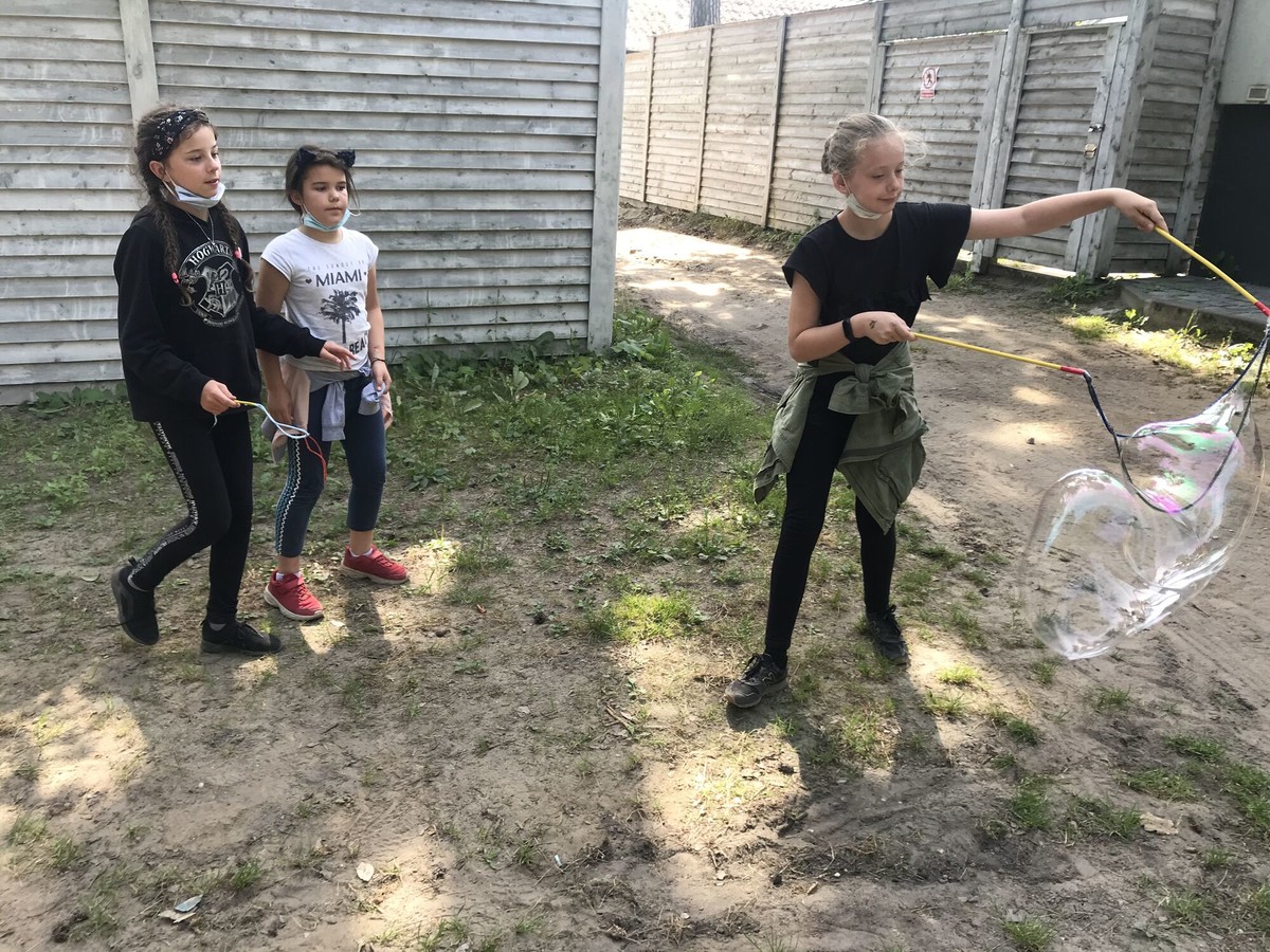 Dzisiejszy dzień rozpoczęliśmy aktywnie, bo od rozegrania meczu siatkówki oraz piłki nożnej. Następnie graliśmy w ziemniaka i mafię w miasteczku. Po obiedzie wzięliśmy udział w zajęciach terenowych Ranny Lotnik z elementami pierwszej pomocy. Później tworzyliśmy bańki mydlane w rozmiarze XXL. Wieczorem wybraliśmy się na żyroskop i mogliśmy poczuć się jak podczas lotu kosmicznego.