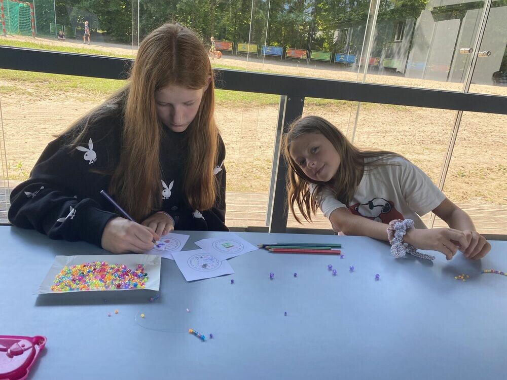 Kolejny dzień rozpoczęłyśmy od tworzenia własnej biżuterii. Powstały piękne naszyjniki i bransoletki, które będziemy z dumą nosić. Miałyśmy również okazję zrobić pamiątkowe przypinki. Narysowaliśmy na nich to, co najbardziej skojarzyło nam się z kolonią, aby zawsze móc wrócić do tych świetnych chwil. Dalsza część dnia była również artystyczna. Zrobiłyśmy projekty własnych koszulek, a następnie przeniosłyśmy to na materiał i w ten sposób mamy przepiękne nowe ubrania. Po obiedzie przyszedł czas na zajęcia taneczne. W rytm świetnej muzyki wyskakałyśmy i wybawiłyśmy się za wszystkie czasy. Kolejno nauczyłyśmy się chodzić na szczudłach, przez moment poczułyśmy się jak w cyrku. Nic dziwnego, ponieważ były to zajęcia Ale Cyrk! Wieczór spędziłyśmy relaksując się podczas oglądania filmu w naszym kinie plenerowym.