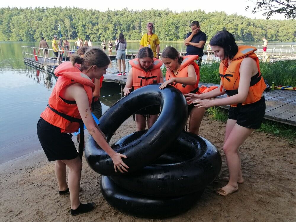 Dzisiejszy dzień rozpoczęłyśmy od wyprawy bezburtowymi, jednoosobowymi kajakami sit on top po jeziorze Łęsk oraz miałyśmy możliwość zaprojektowania wzoru i wykonania graffiti na specjalnie przygotowanej do tego ściance. Następnie urządziłyśmy sobie rozgrywki baloniady, która polega na przerzucaniu balonów z wodą za pomocą ręczników na stronę przeciwnika. Po obiedzie poszłyśmy na zajęcia, które polegają na jednoczesnym budowaniu i wspinaniu się z asekuracją na wieżę budowaną wraz ze wspinaniem właśnie ze skrzynek. Wieczór natomiast spędziłyśmy na grze terenowej, podczas której musiałyśmy rozwiązywać zagadki, aby odnaleźć bombę i uratować świat przed złym Simonem.