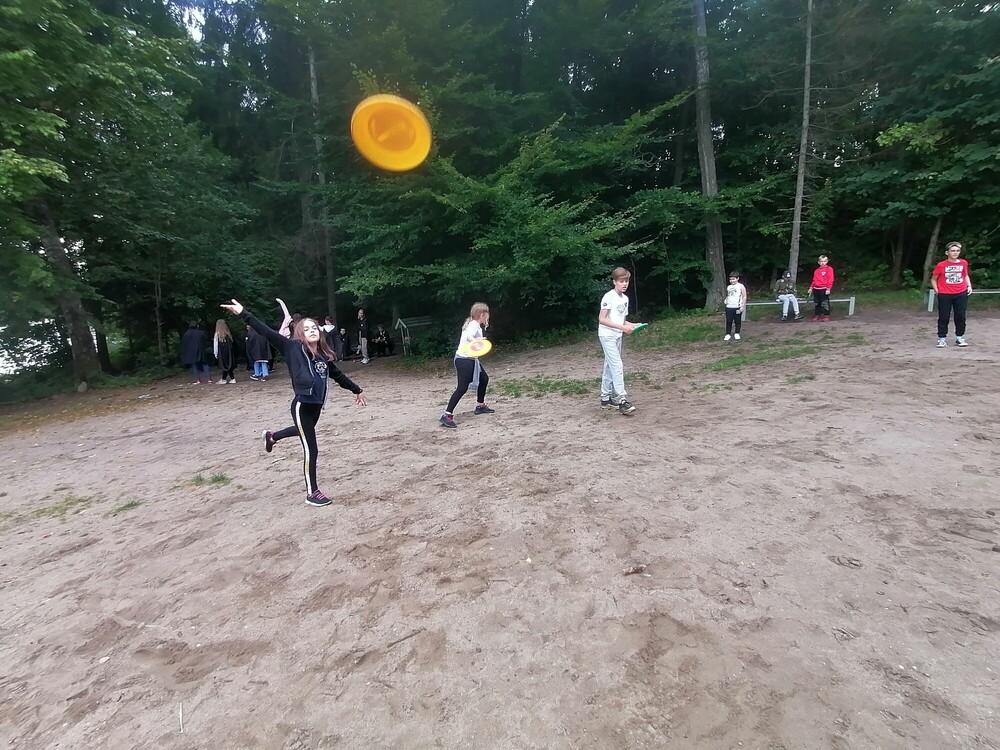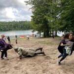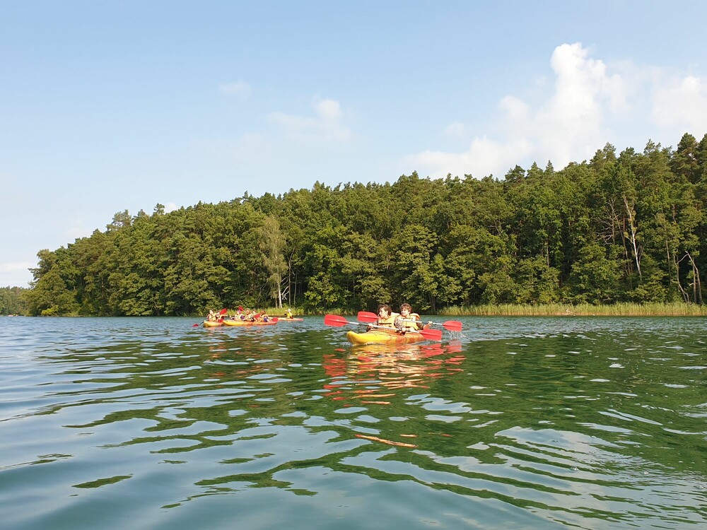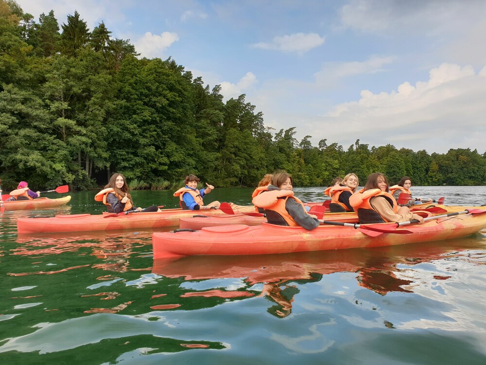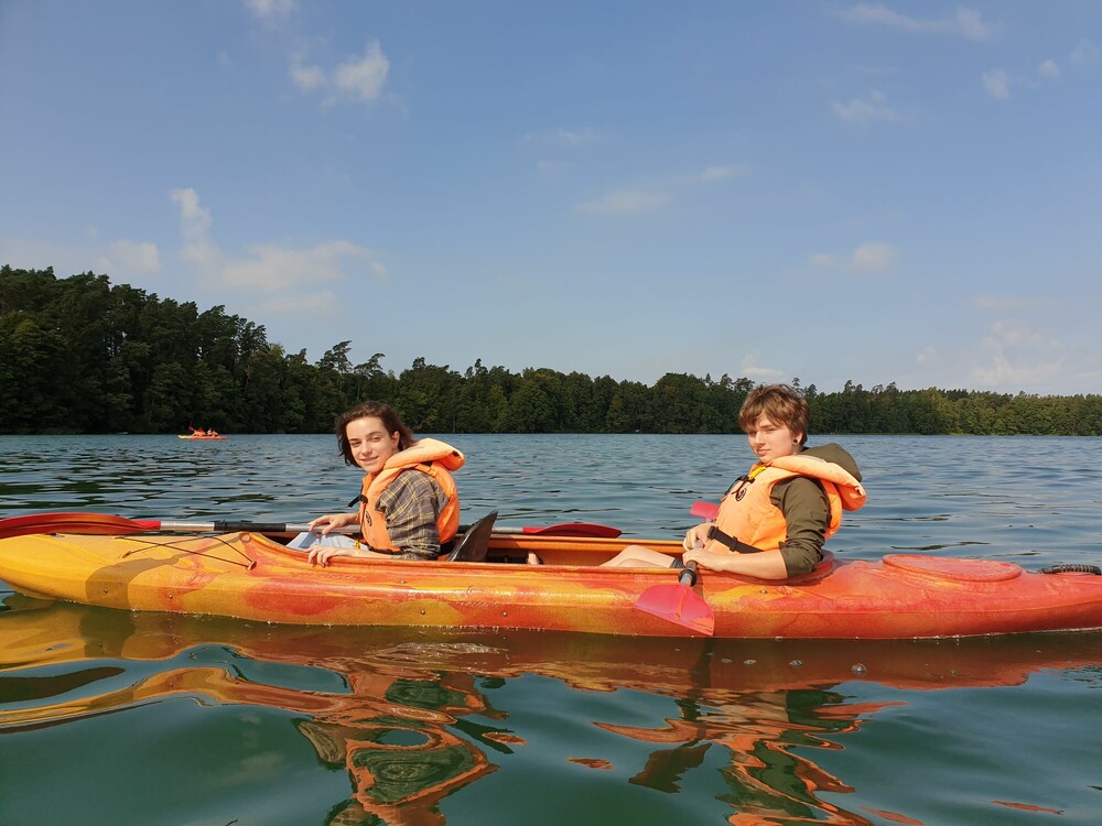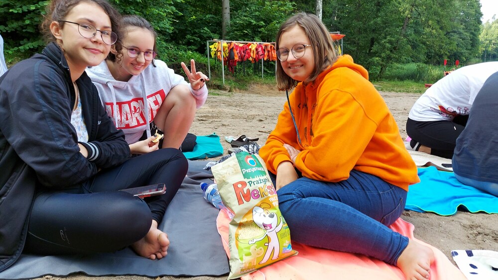 Niedziela była pełna wrażeń i niezapomnianych przeżyć! Z rana graliśmy w mega gry. Sprawdziliśmy swoją koordynację ruchową podczas gry w twistera w rozmiarze XXL oraz refleks w czasie układania jengi i bierek. W południe udaliśmy się do lasu, aby wziąć udział w leśnej grze terenowej. Naszym zadaniem było ukrycie swoje flagi i odebranie flagi przeciwnikom. Przed obiadem mieliśmy sposobność poznać gry z różnych miejsc na świecie – bule, molkky i innych. Po chwili przerwy udaliśmy się na spływ jednoosobowymi kajakami po pięknym jeziorze Łęsk. Dla każdego było to zupełnie nowe doświadczenie! Wieczór spędziliśmy na ognisku integracyjnym piekąc kiełbaski oraz rozmawiając.