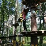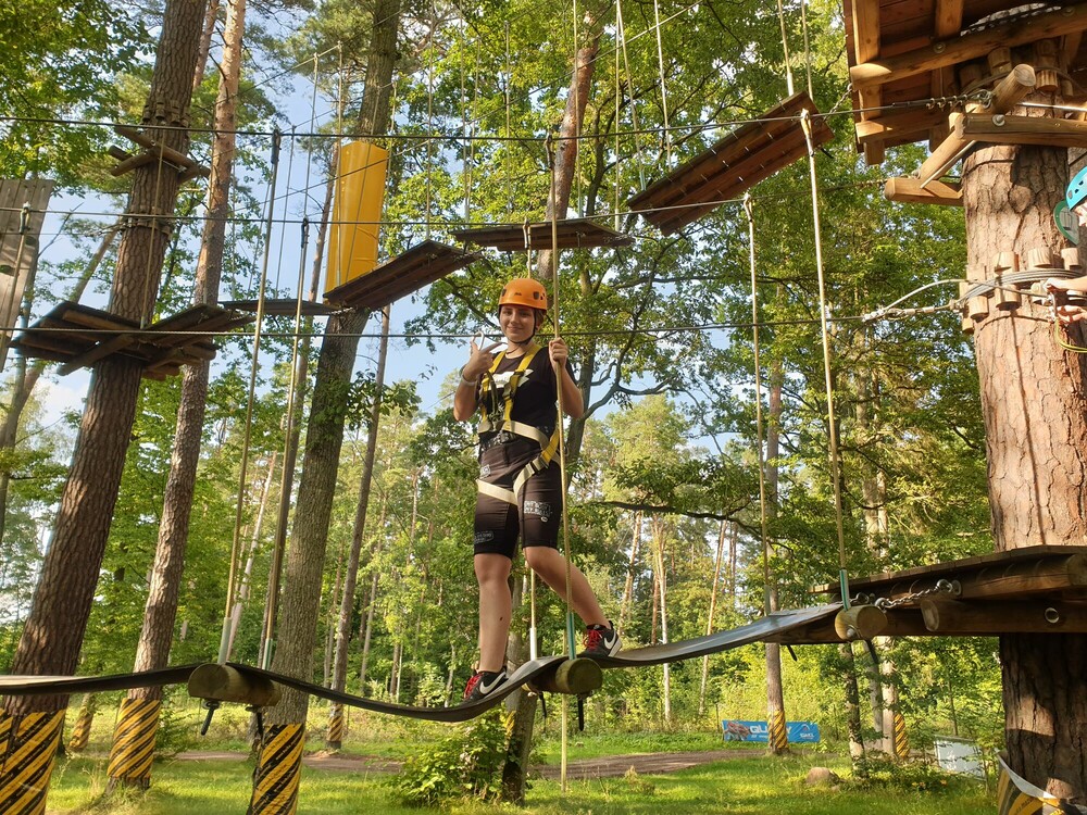 Dzisiejszy dzień rozpoczęliśmy od przejścia parku linowego trasami o dwóch poziomach trudności. Następnie wybraliśmy się na wyprawę smoczą łodzią po jeziorze Łęsk. Później sprawdzaliśmy swoją celność na strzelnicy paintballowej, a potem uczyliśmy się jeździć dziwnym rowerem. Wieczór spędziliśmy na tańcach i zabawach na dyskotece.
