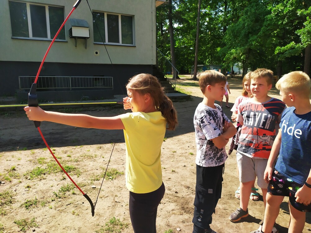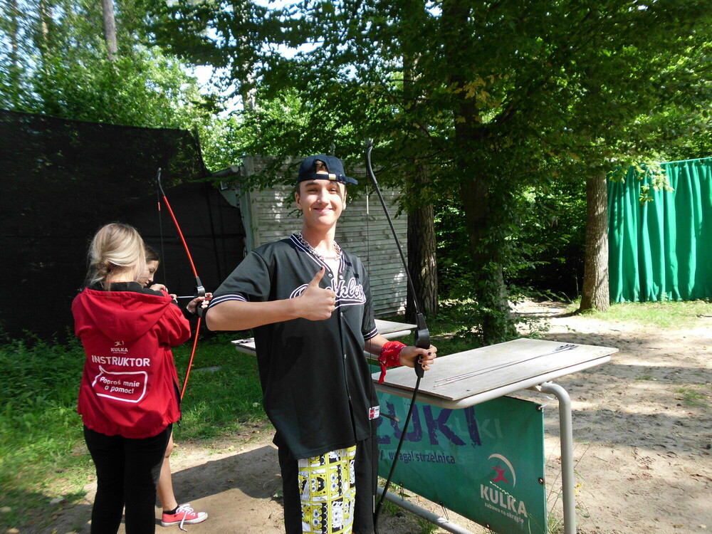 Ale to był intensywny dzień! Rozpoczęliśmy go od strzelania z łuku, ćwiczyliśmy swoją celność i dokładność. Niektórym udało się nawet strzelić w sam środek! Następnie za pomocą kompasu wyznaczającego azymut szukaliśmy numerków. Po ich znalezieniu mogliśmy rozwiązać zagadki. Po grze Błędny Azymut zagraliśmy w passball, czyli piłkę nożną w specjalnych strojach oraz korfball, czyli trochę inną wersję koszykówki. Po obiedzie wybraliśmy się na plażę, kąpaliśmy się oraz odpoczywaliśmy. Po kolacji zaś mieliśmy okazję nauczyć się chodzić na szczudłach. Udało się wszystkim! Później mieliśmy naszą pierwszą dyskotekę, podczas której bawiliśmy się świetnie przy najnowszych hitach!