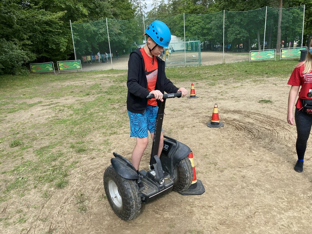 Dzisiejszy dzień był bardzo ciekawy, ponieważ tuż po śniadaniu popłynęliśmy smoczą łodzią. Było cudownie! Następnie odbyły się zajęcia polegające na robieniu znaczków, czyli przypinek, które każdy z nas mógł zaprojektować według swojego uznania. Później byliśmy na ściance wspinaczkowej. Każdy mógł wspiąć się drogami o różnym poziomie trudności. Po obiedzie był czas na zabawy frisbee oraz jazdę segwayem, co stanowiło dla nas duże wyzwanie. Wieczorem graliśmy w kolory oraz w grę koncentracja. Dzień spędziliśmy wspaniale. Teraz czekamy na następne atrakcje.