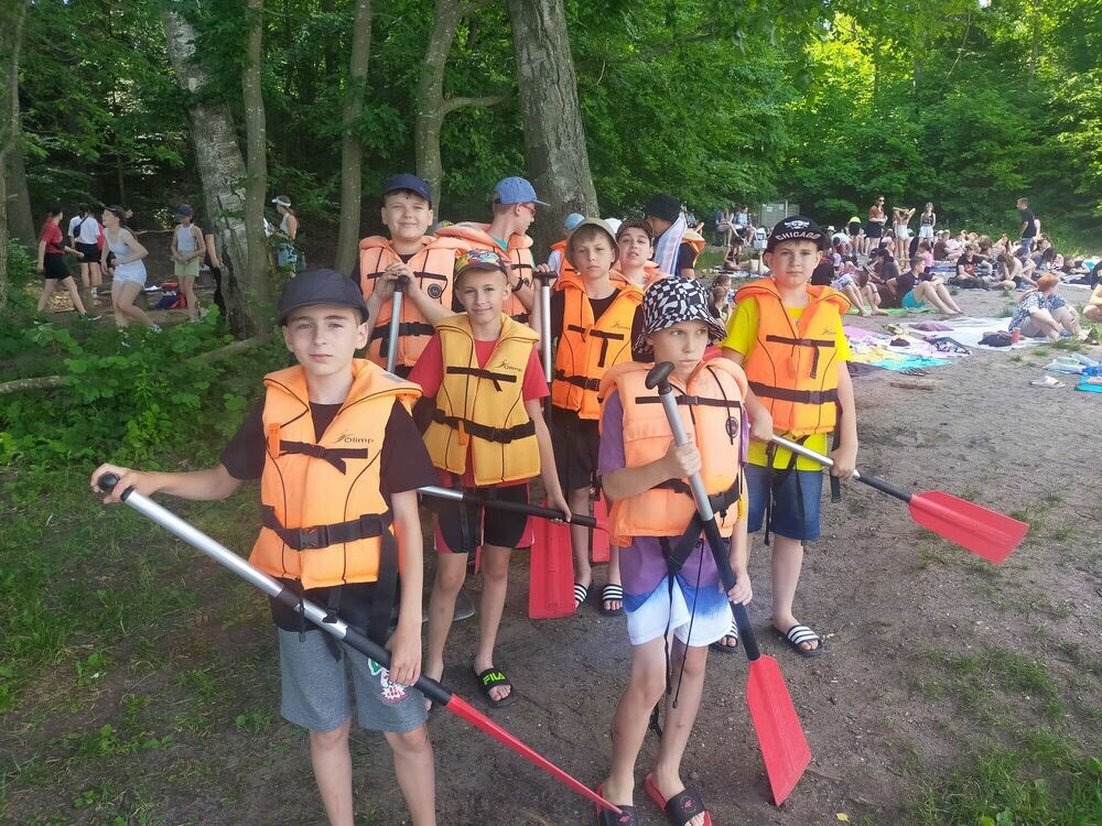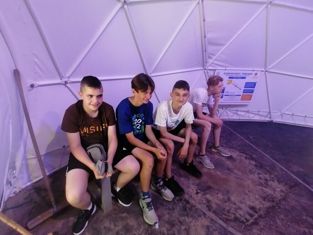 Drugi dzień kosmicznej misji rozpoczęty! Na początku zjedliśmy pyszne śniadanie, następnie przeprowadziliśmy emocjonującą walkę gladiatorów. Później płynęliśmy wspólnie rowerami wodnymi po jeziorze Łęsk. Korzystając z pięknej i gorącej pogody, plażowaliśmy i kąpaliśmy się. Było super! Po pysznym obiedzie odbył się seans filmowy „Magiczny glob” w gwiezdnym kinie. Nauczyliśmy się strzelać z łuku, a na koniec kosmicznego dnia oddaliśmy strzały w strzelnicy paintballowej. Czekamy na jeszcze więcej wrażeń!