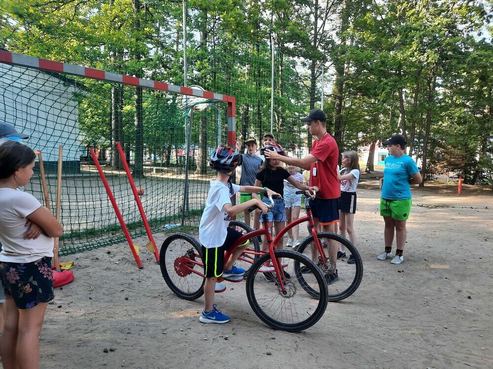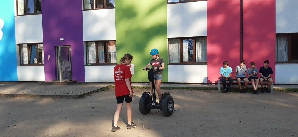 Dziś robiliśmy eksperymenty w Laboratorium, potem chodziliśmy na szczudłach, jeździliśmy na cyrkowym rowerze i na segwayu. Spędziliśmy też trochę wolnego czasu na plaży, gdzie puszczaliśmy kaczki i odpoczywaliśmy po aktywnościach. Potem pływaliśmy kajakami i zagraliśmy w grę terenową oraz uczyliśmy się pierwszej pomocy. W międzyczasie jedliśmy dobre posiłki i dużo rozmawialiśmy ze sobą.