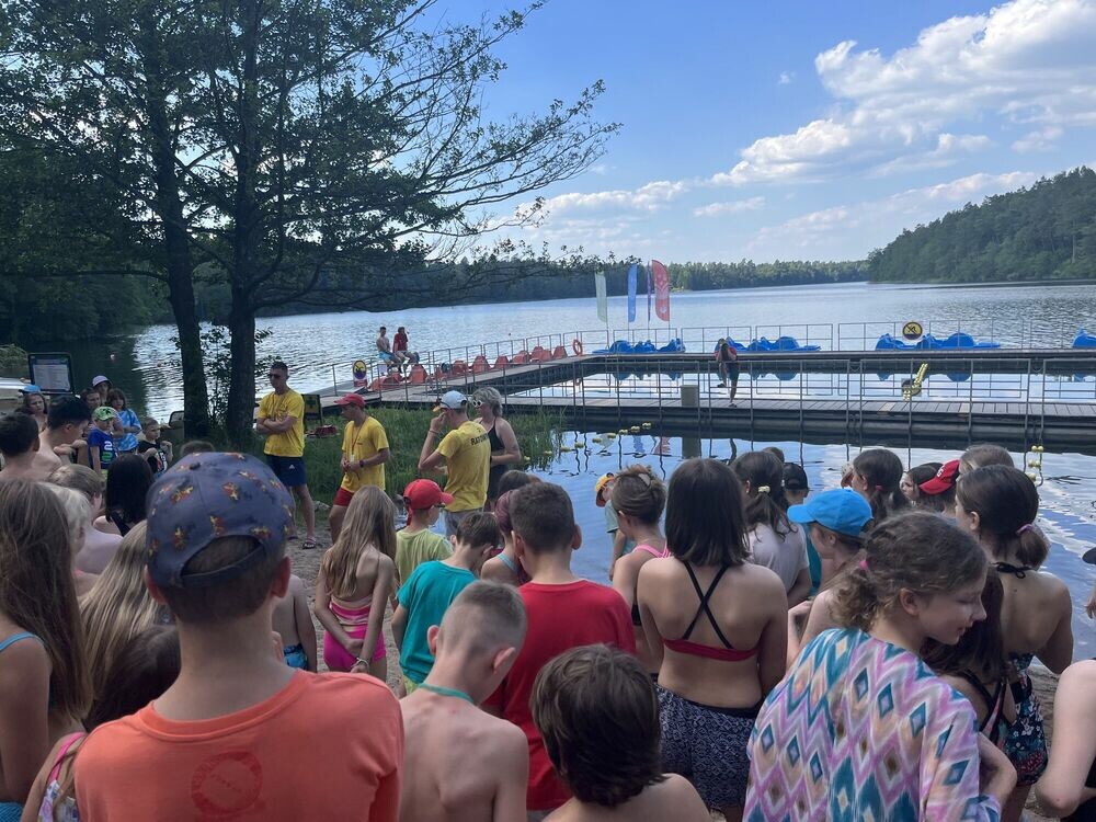 Niedziela rozpoczęła się od smacznego śniadanka. Rano spróbowaliśmy swoich sił w ciekawych grach pochodzących z różnych zakątków świata, podczas których rywalizowaliśmy w drużynach. Na kolejnych zajęciach poczuliśmy się jak prawdziwi alpiniści, stawiając czoła ściance wspinaczkowej. Wielu z nas dotarło na samą górę! Następnie ratownicy wodni zaznajomili nas z zasadami bezpiecznego przebywania na kąpielisku i czuwali nad nami, gdy korzystaliśmy z dobrej pogody nad wodą. Po obiedzie odwiedziliśmy całą grupą pielęgniarkę, potem próbowaliśmy zachować równowagę w kuli wodnej, a wieczór spędziliśmy jeżdżąc na quadzie i oglądając piękny zachód słońca.