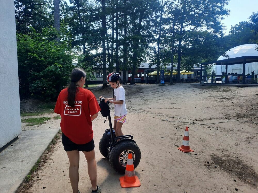 Nasza kulkowa przygoda trwa już w najlepsze. Dzień zaczęliśmy spokojnie, zajęciami artystycznymi - staraliśmy się opanować sztukę quillingu. Stworzyliśmy piękne prace, z których każdy z nas był dumny. Później uczyliśmy się jeździć na segwayach - nie było to łatwe, jednak każdemu udało się wykonać po dwa okrążenia na torze przeszkód. Przed obiadem nastał czas na relaks - plażowanie i kąpiele. Przy upalnej pogodzie orzeźwiająca kąpiel w jeziorze była w sam raz. Potem udaliśmy się na obiad oraz na spotkanie z pielęgniarką. Po południu stawiliśmy czoła kolejnym wyzwaniom - chodzeniu na szczudłach oraz jeździe dziwnym rowerem. Wieczorem przyszedł czas na pierwszą grę terenową, która odbyła się na terenie ośrodka.