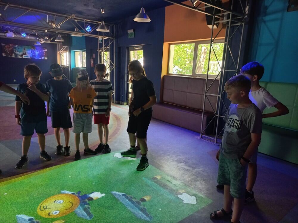 Dzień rozpoczęliśmy aktywnie od zabawy na wirtualnych dywanach. Następnie udaliśmy się na plażowanie i kąpiel w jeziorze, a po wodnych przyjemnościach odpoczęliśmy podczas sensu 3D w kinie gwiezdnym. Sprawdziliśmy również swoje umiejętności pracy z kompasem w grze terenowej Błędny Azymut oraz udaliśmy się na wizytę u pielęgniarki. Dzień przypieczętowaliśmy wspólnym ogniskiem z pieczeniem kiełbasek.