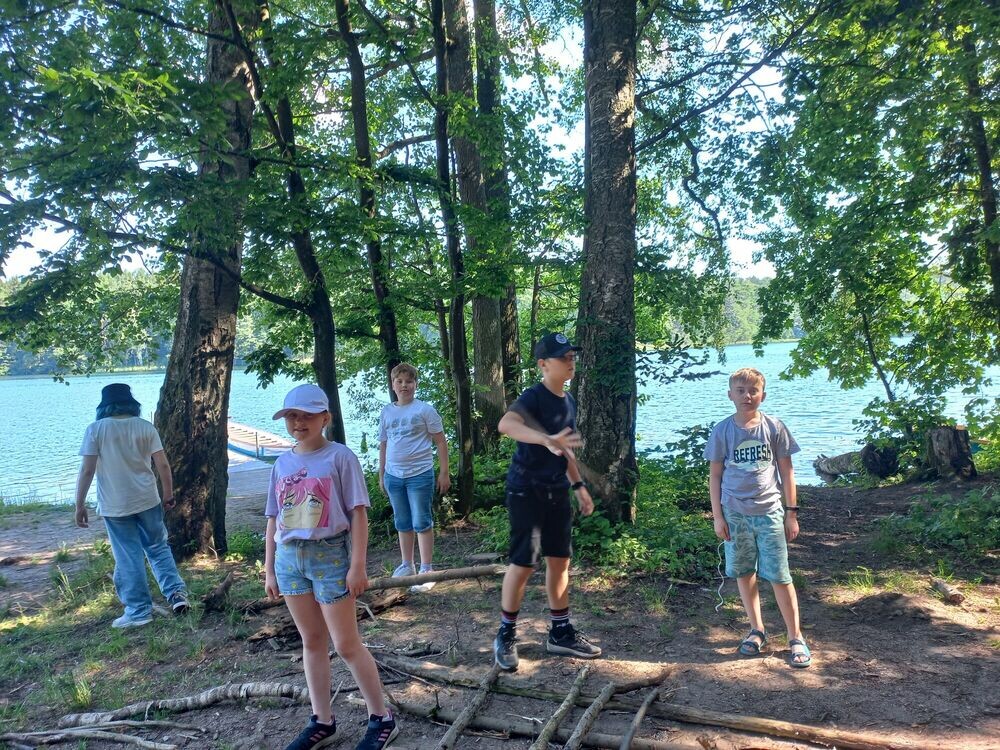Dzień rozpoczęliśmy od przejścia parku linowego. Po szkoleniu naziemnym mieliśmy możliwość pokonania dwóch tras o różnych poziomach trudności. Następnie udaliśmy się na plażę, aby skorzystać z pięknej pogody i uroków pobliskiego jeziora Łęsk – opalaliśmy się i korzystaliśmy z kąpieliska. Później wzięliśmy udział w zajęciach z survivalu, w czasie których poznaliśmy jego podstawy, budowaliśmy schronienie z wojskowej pałatki i poznaliśmy zawartość puszki survivalowej. Po pysznym obiedzie poznaliśmy podstawy musztry, aby następnie doskonalić jej technikę. Później wspólnie wykonaliśmy flagę obozową przy użyciu farb i płótna. Wieczorem razem bawiliśmy się i śpiewaliśmy przy ognisku, aby potem piec nad nim kiełbaski i chleb.