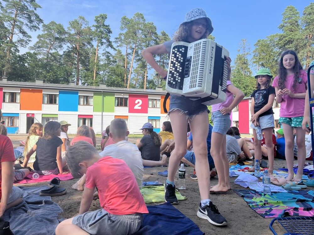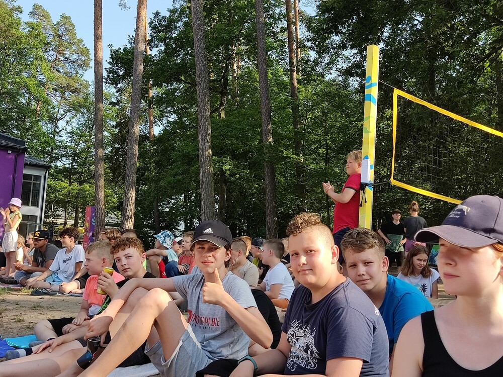 Dzisiaj wzięliśmy udział w drugiej części zajęć survivalowych. Uczyliśmy się jak pozyskiwać i filtrować wodę. Układaliśmy stosy ogniskowe i wzniecaliśmy ogień przy pomocy krzesiwa. Następnie spróbowaliśmy swoich sił w olimpiadzie sportowej. Kolejną atrakcją był park linowy. Rozegraliśmy dziś pierwszy mecz turniejowy w piłkę nożną. Udaliśmy się na Talent Show i oglądaliśmy pokazy naszych koleżanek i kolegów. Byliśmy również na plaży. Kąpaliśmy się w jeziorze i spędziliśmy miło czas przy muzyce w trakcie wieczoru rozrywkowego.