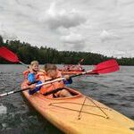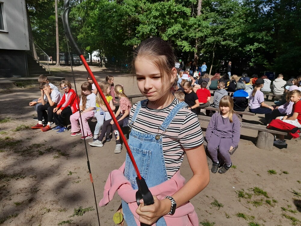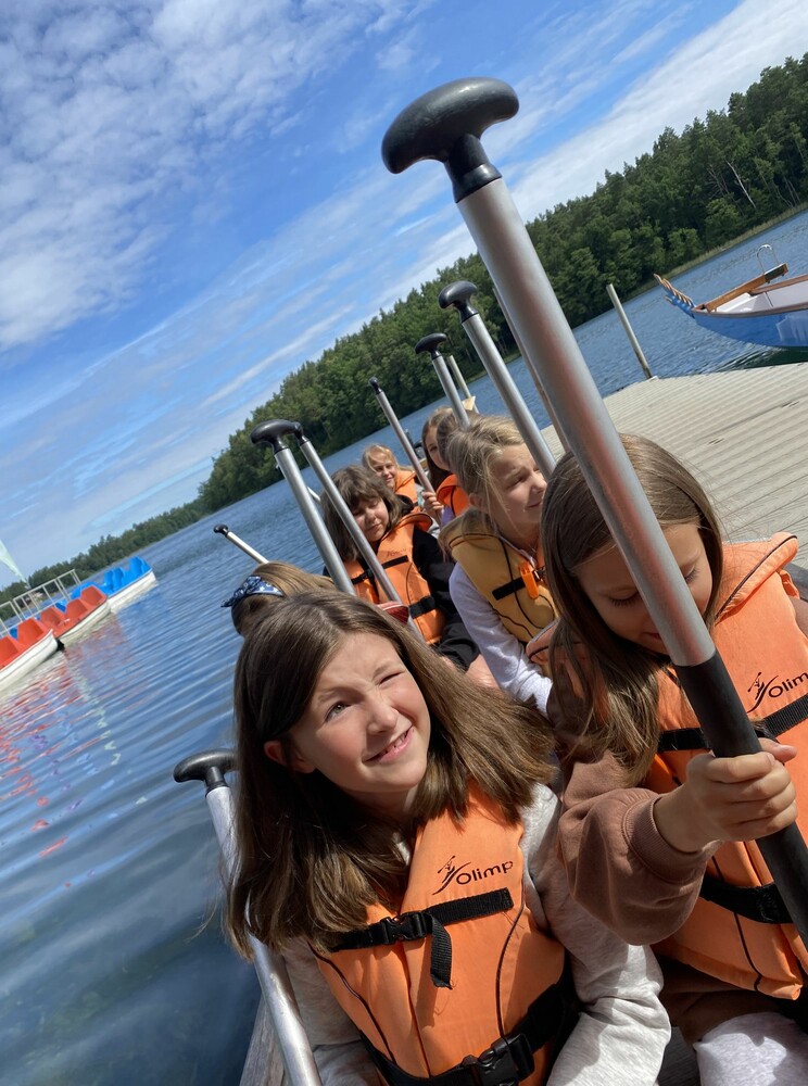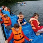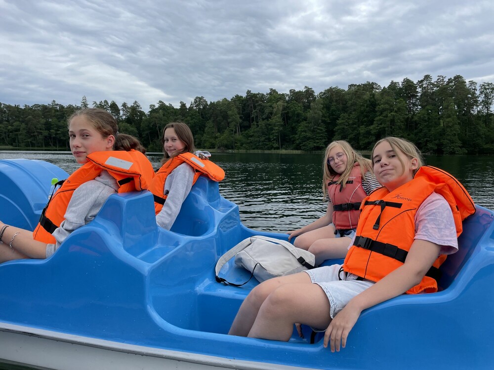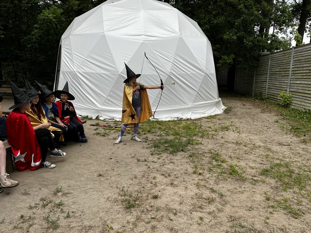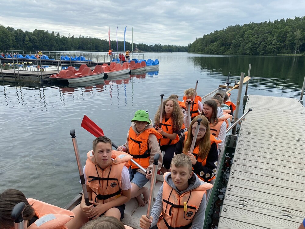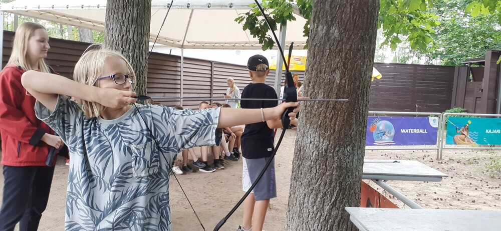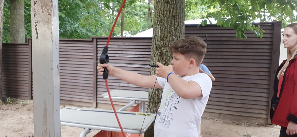 Czwartek rozpoczęliśmy od wizyty u pani pielęgniarki oraz gier i zabaw integracyjnych, aby jeszcze lepiej się poznać i super spędzić najbliższe dni. Następnie udaliśmy się na zajęcia, podczas których nauczyliśmy się strzelać z łuku do celu. Zdobytą umiejętność mieliśmy później okazję wykorzystać podczas zajęć Archery Challenge, które polegały na zbudowaniu fortu i obrony go podczas bitwy z wykorzystaniem bezpiecznych łuków. Po obiedzie nauczyliśmy się robić bransoletki ze sznurka, a także udaliśmy się na wyprawę rowerami wodnymi po naszym malowniczym jeziorze Łęsk. Wieczór spędziliśmy na grze Awantura o Wiedzę, podczas której licytowaliśmy pytania z różnych dziedzin nauki.