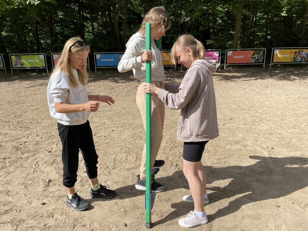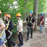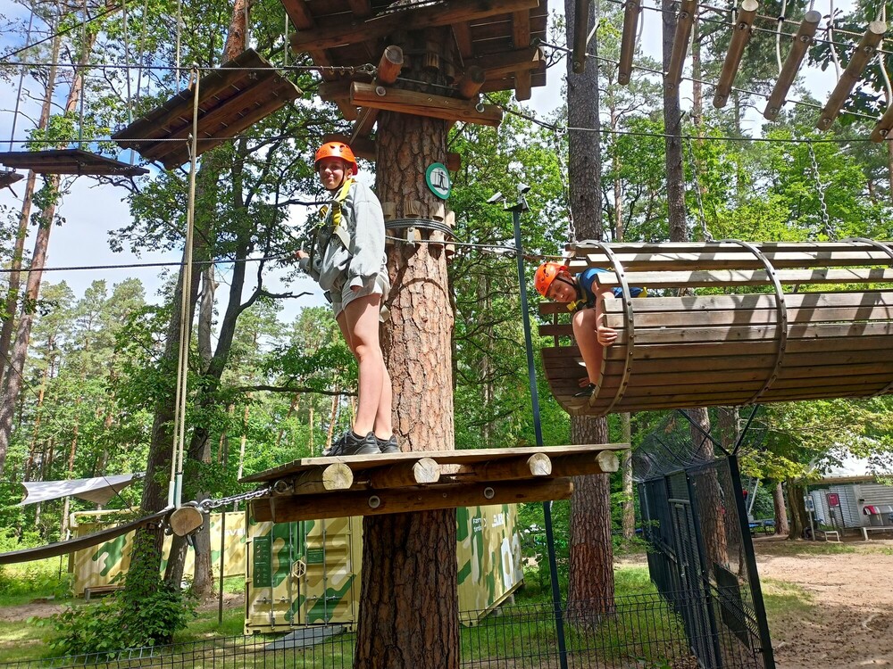 Relaks na rowerach wodnych odbył się tuż po śniadaniu i to właśnie w taki sposób rozpoczęliśmy nasz wspaniały dzień. Jezioro Łęsk pięknie nas przywitało. Na parku linowym zmierzyliśmy się z lękiem wysokości, który szybko przezwyciężyliśmy. Zabawa piłka na opak oraz późniejsza jazda na dziwnym rowerze i chodzenie na szczudłach zapewniły nam masę śmiechu. Na koniec wyciszyliśmy się na ognisku, gdzie cieszyliśmy się spokojnymi pląsami, grami i pieczeniem kiełbasek.