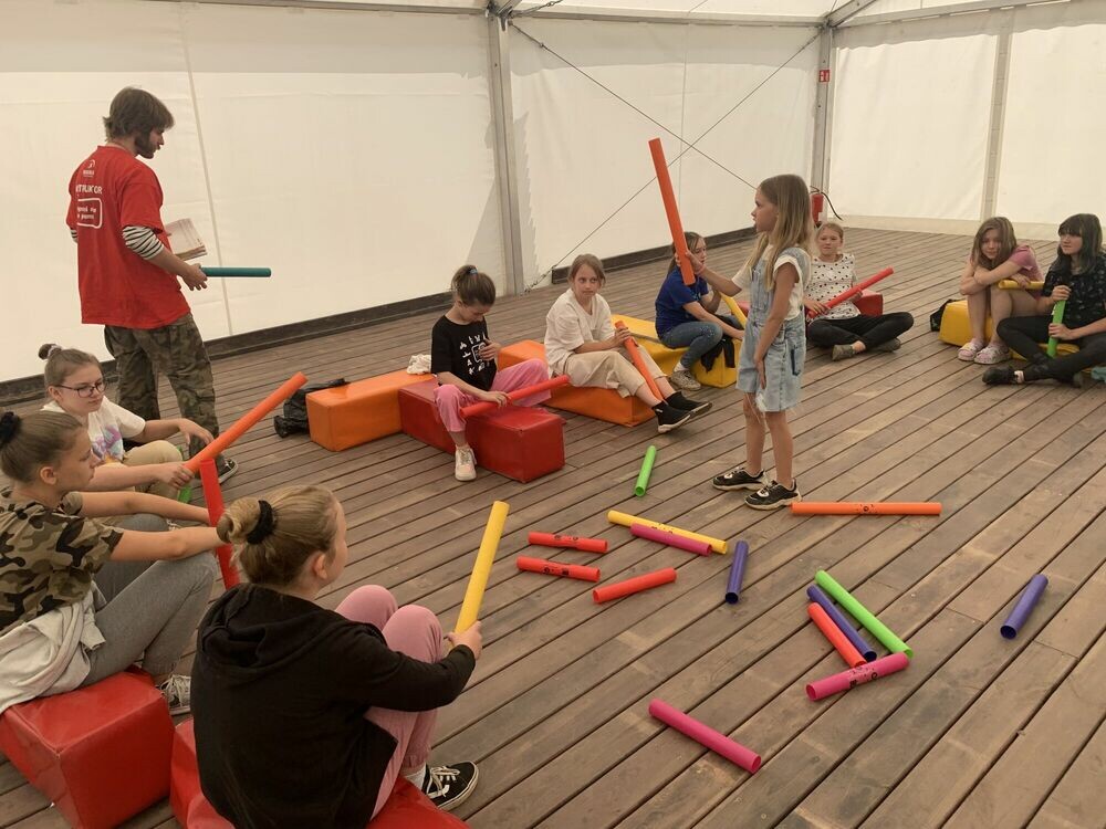 Szósty dzień w Kulce rozpoczęłyśmy od stworzenia własnych znaczków, następnie miałyśmy okazję nauczyć się grać na bum bum rurkach, udało nam się zagrać nasze ulubione piosenki. Po obiedzie konstruowałyśmy wielkie budowle ze słomek i krzyżyków, a później wcieliłyśmy się w miasteczkową mafię i uratowałyśmy nasze miasto. Dzień pełen atrakcji i przygód zakończyłyśmy zabawami integrującymi naszą grupę.