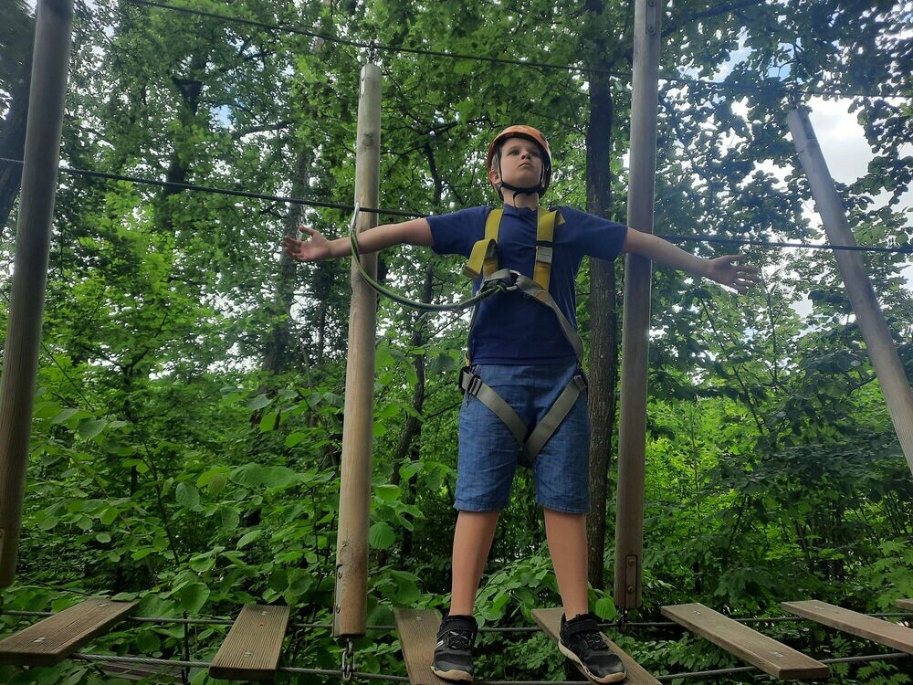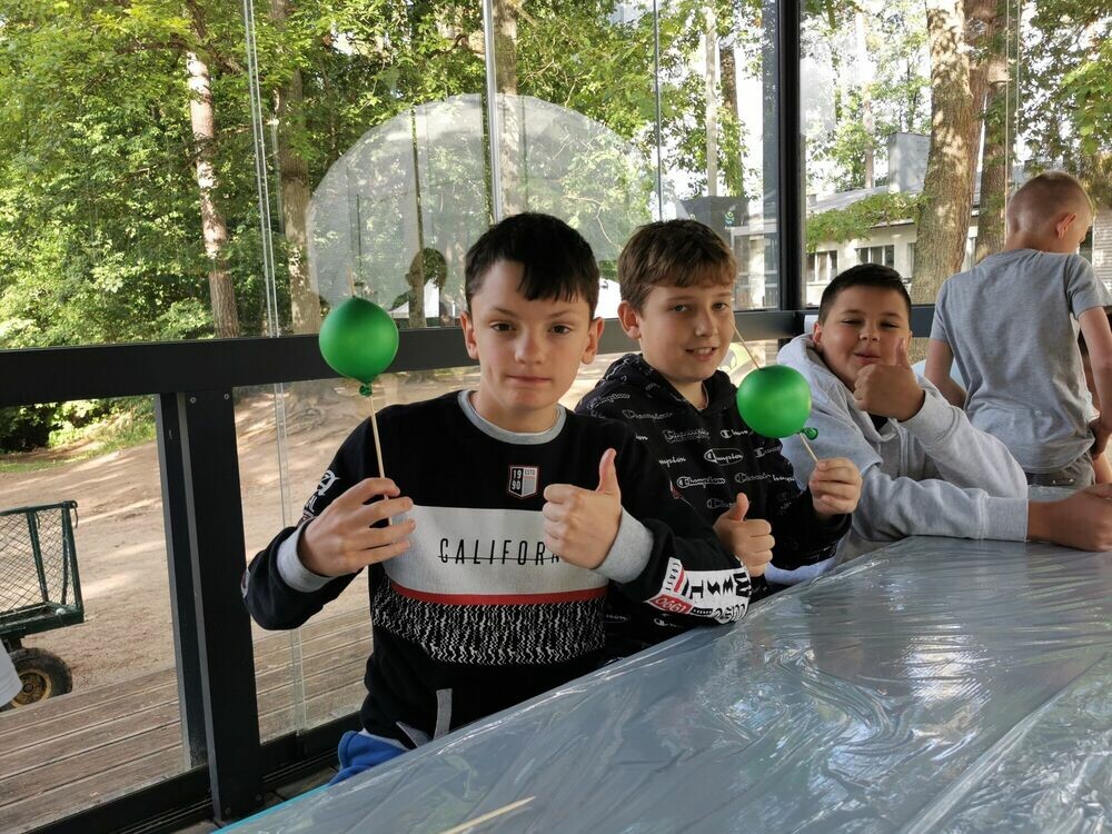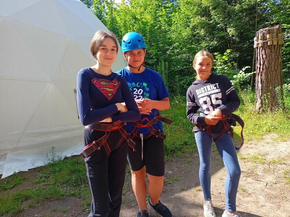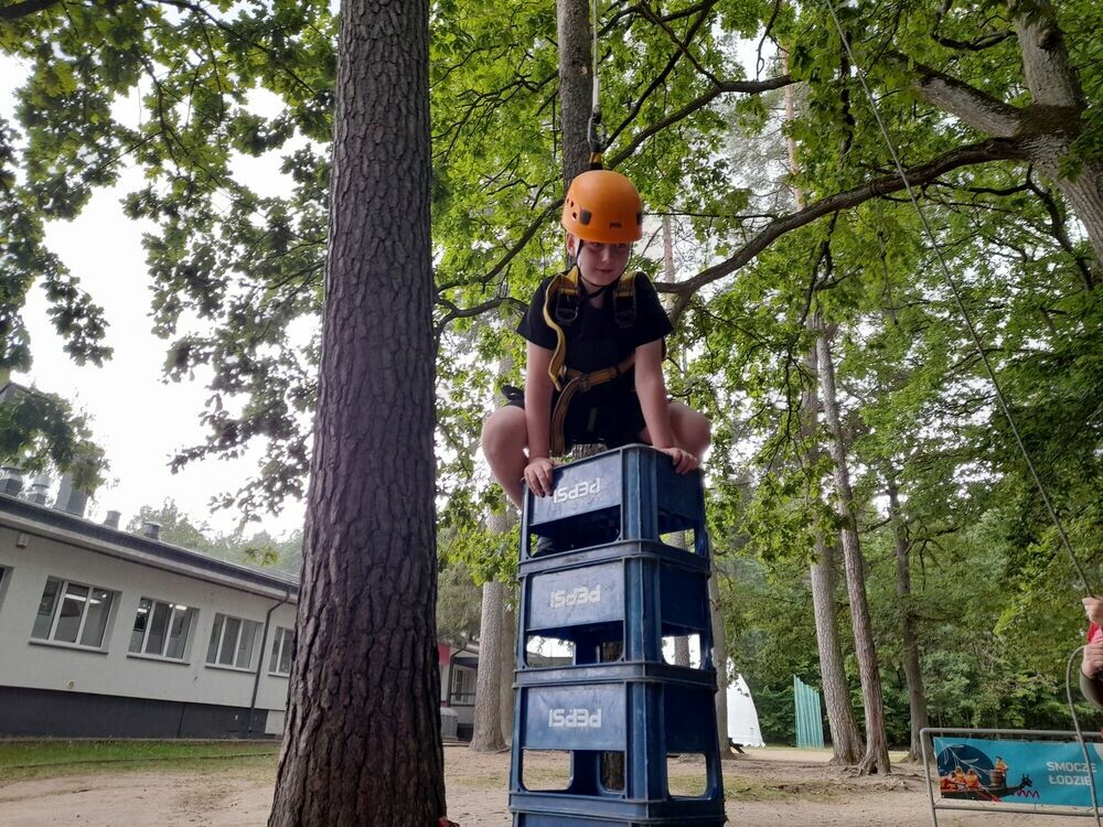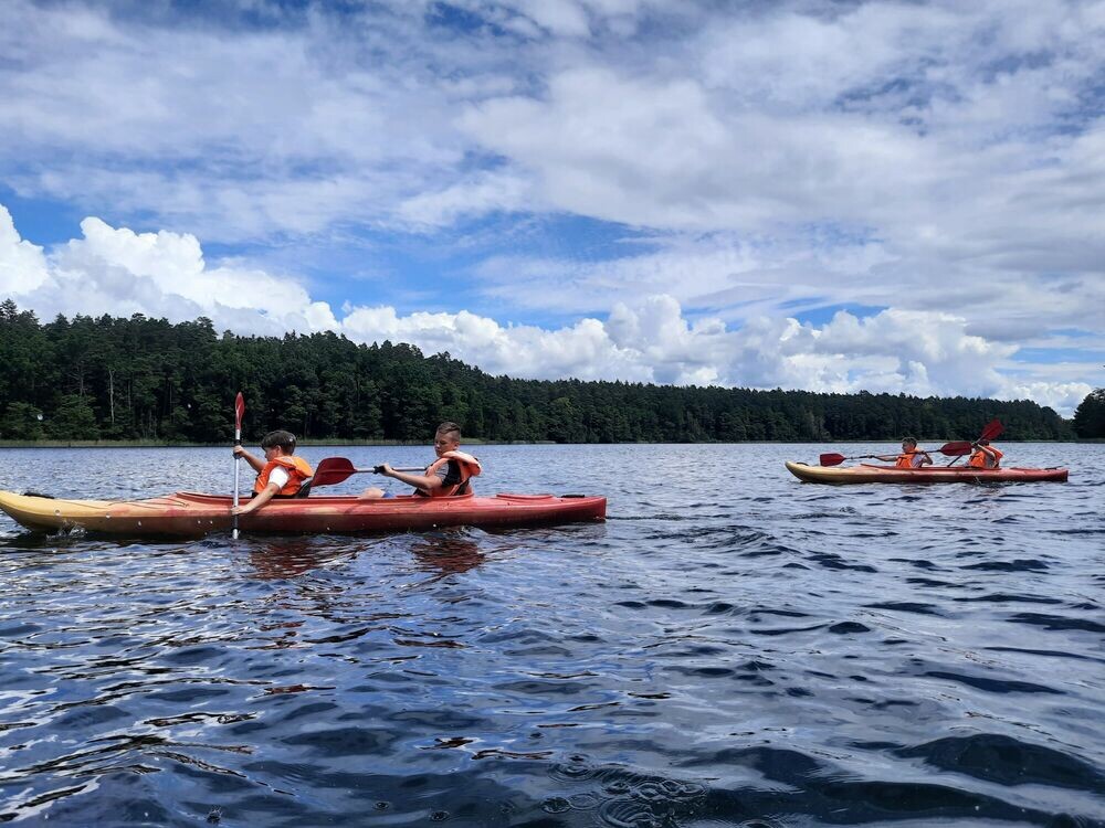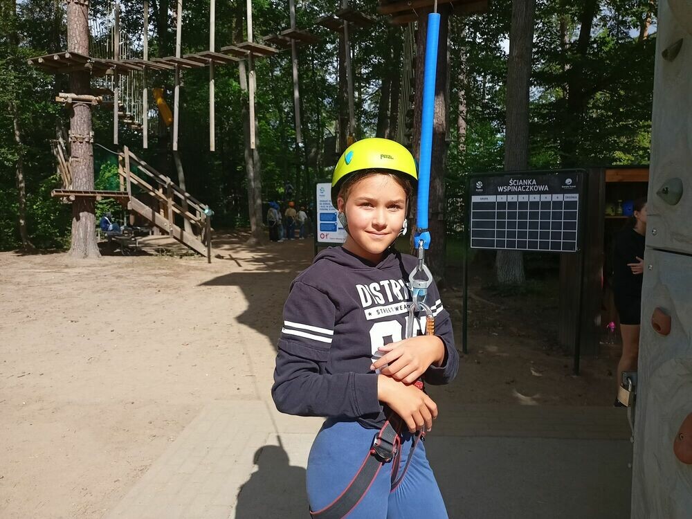 Dzień rozpoczęliśmy od wspólnych gier i zabaw, a następnie nauczyliśmy się podstawowych technik szyfrowania wiadomości. Zdobytą wiedzę połączyliśmy z praktycznym wykorzystaniem technik podczas gry terenowej. Wybraliśmy się również na wyprawę dwuosobowymi kajakami po jeziorze Łęsk. Zabawa w wodzie dała nam wiele radości. Przeszliśmy także przez park linowy, który miał dwa poziomy. Każdy z nas wybrał trasę według swoich możliwości. Z uśmiechem na twarzy przychodziliśmy przez przeszkody. Dzień zakończyliśmy wspólną grą w piłkę nożną. Był to dzień pełen zabawy i radości. Nie możemy doczekać się kolejnych dni i atrakcji.