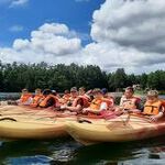 Nowy tydzień, nowy dzień, nowe atrakcje. Poniedziałek rozpoczęliśmy od trzygodzinnej wyprawy kajakami aż na drugie jezioro. W międzyczasie śpiewaliśmy szanty i świetnie się przy tym bawiliśmy. Koledzy ozdobili kajak, a Maja i Kinga wygrały pościg za panią ratownik. Po obiedzie nadeszła pora na wyczekiwaną ściankę wspinaczkową. Wiele z nas ukończyło trasę głośnym dzwonkiem sygnalizującym zdobycie szczytu. Później graliśmy w grę francuską, w której mogliśmy wykazać się wiedzą o kolonii. Wieczorem przyszedł czas na grę terenową Mafię. Mocno ekscytujący dzień!