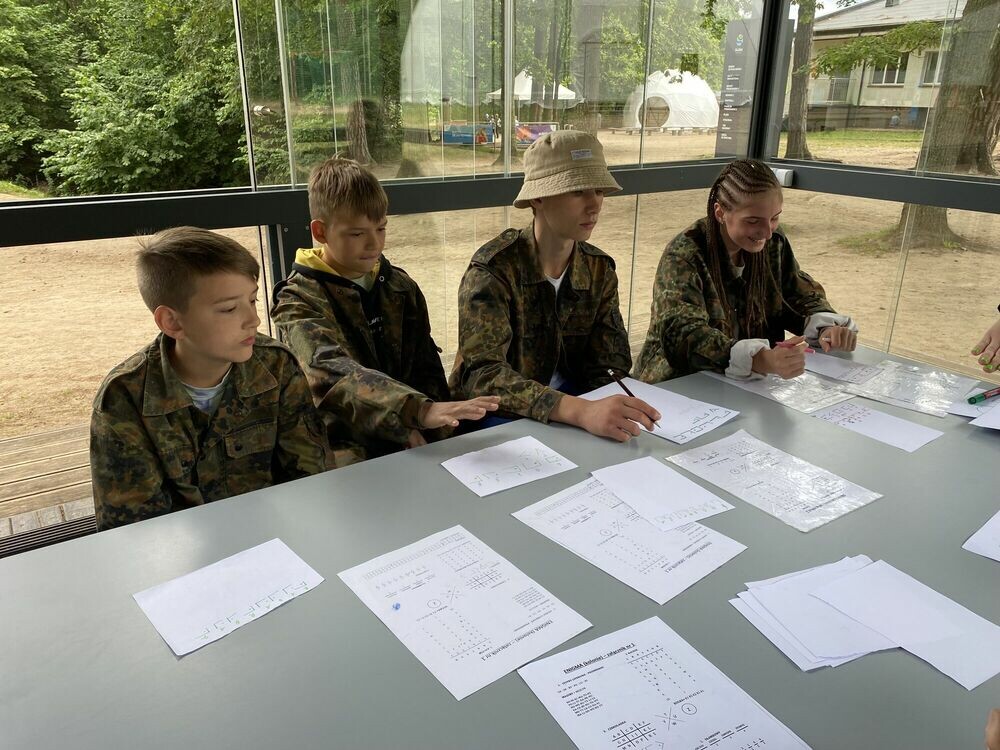 Poniedziałek rozpoczęliśmy od sprawdzenia swoich umiejętności snajperskich na strzelnicy paintballowej. Zrobiliśmy turniej strzelecki celując do tarcz rozstawionych w dwóch różnych odległościach. Potem zmierzyliśmy się w quizie, podczas którego licytowaliśmy się i odpowiadaliśmy na pytania z kategorii zbliżonych do tematyki naszego obozu. Motyw wojska i militariów towarzyszy nam przez cały czas. Następnie przemierzaliśmy specjalnie przygotowany tor na quadach. Po pysznym obiedzie pływaliśmy po jeziorze Łęsk na kajakach turystycznych, a do tego podziwialiśmy piękne widoki dookoła. Wieczorem trenowaliśmy swoje umiejętności z działań strategicznych oraz przypominaliśmy sobie wiedzę z taktyki.