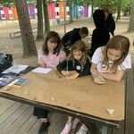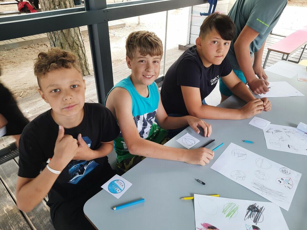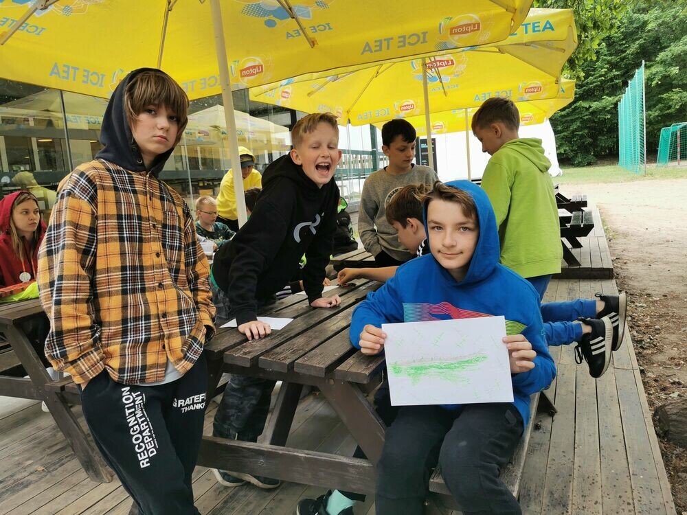 Piątek zaczęliśmy od rozruszania naszych ciał za pomocą tańca. Oprócz choreografii, którą już dobrze znamy, nauczyliśmy się jednej nowej. Była super. Następnie czekały na nas warsztaty wrażliwości estetycznej, które uruchomiły naszą wyobraźnię w oparciu o informacje, jakie poznaliśmy w tajnej Strefie UFO parę dni temu. Później poznaliśmy jedne z najbardziej rozpoznawalnych symboli różnych kontynentów oraz państw. Jako że nasze kolonie opierają się na tematyce kosmicznej, zrobiliśmy flagi i ilustracje przedstawiające inne planety, istniejących lub takich, jakie wymyśliliśmy, wspólnie omawialiśmy ich znaczenie. Przed kolacją trenowaliśmy nasze głosy na karaoke, śpiewając ulubione piosenki. Wieczorem odbył się apel podsumowujący nasz turnus, zostały na nim rozdane nagrody za przeróżne konkursy.