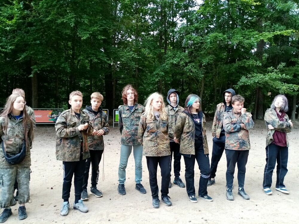 Dzień rozpoczęliśmy od gry paintballowej, na którą udaliśmy się zaraz po śniadaniu. Ubrani w kombinezony i maski chowaliśmy się za bunkrami unikając strzałów z kolorowych kulek z farbą. Później wybraliśmy się na boisko i zagraliśmy w koszykówkę. Po obiedzie braliśmy udział w Operacji Desantowej Przyczółek. Na początku pływając kajakami po jeziorze szukaliśmy ukrytych przy brzegach zadań. Po powrocie dokończyliśmy grę na ośrodku, a w nagrodę otrzymaliśmy pamiątkowe nieśmiertelniki. Na pewno będą nam towarzyszyły przez długie lata.