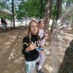 Prawie ostatni dzień kolonii za nami. Rozpoczęliśmy go od pysznego śniadania, po którym wyszywaliśmy pagony. Ozdabialiśmy nasze mundury różnymi wzorami przy pomocy muliny. Później rozegraliśmy mecz paintballu. Biegaliśmy po specjalnie przygotowanej arenie, ukrywaliśmy się za bunkrami i strzelaliśmy z markerów pełnych kulek z kolorową farbą. Po obiedzie wzięliśmy udział w Operacji Desantowej Przyczółek. Na początku przy użyciu mapy przepływaliśmy na kajakach jezioro szukając ukrytych zadań. Po powrocie na brzeg rozwiązywaliśmy kolejne zadania, za wykonanie których otrzymaliśmy pamiątkowe nieśmiertelniki. Po kolacji udaliśmy się na apel podsumowujący cały nasz pobyt. Bardzo się cieszymy, że nasze kolonie były tak udane!
