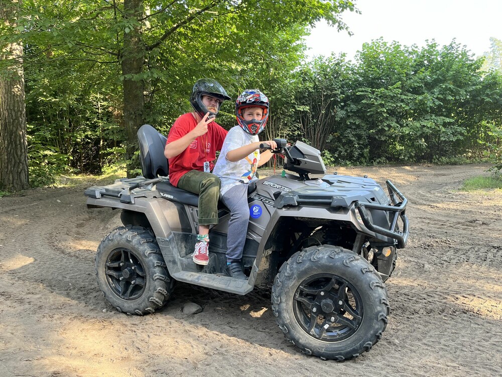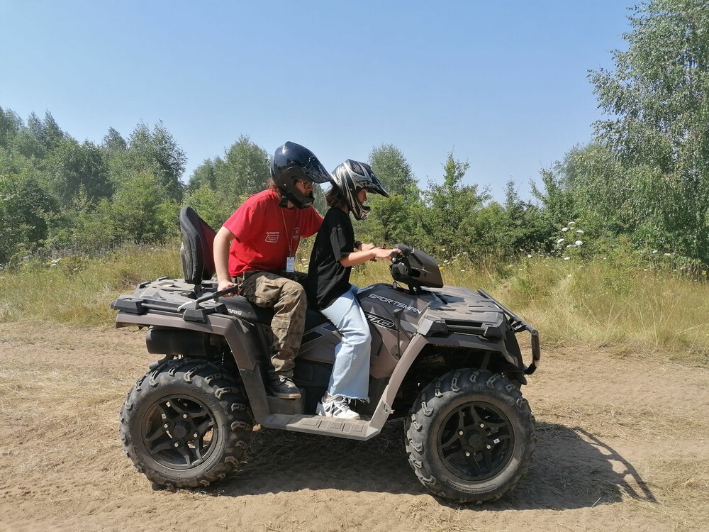 Nasz kolejny dzień przygód rozpoczęliśmy od wyjścia na poligon, gdzie korzystaliśmy z wielu atrakcji. Jeździliśmy rangerem, następnie pokonywaliśmy tor na segwayu. Później w zorbie staczaliśmy się z góry. A na koniec jeździliśmy quadami. Po zjedzeniu obiadu i odpoczynku udaliśmy nad jezioro, gdzie kąpaliśmy się i odpoczywaliśmy na plaży. Następnie wypłynęliśmy na wyprawę rowerami wodnymi. Wieczorem mieliśmy ognisko z zabawami, a następnie z pieczeniem kiełbasek.