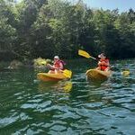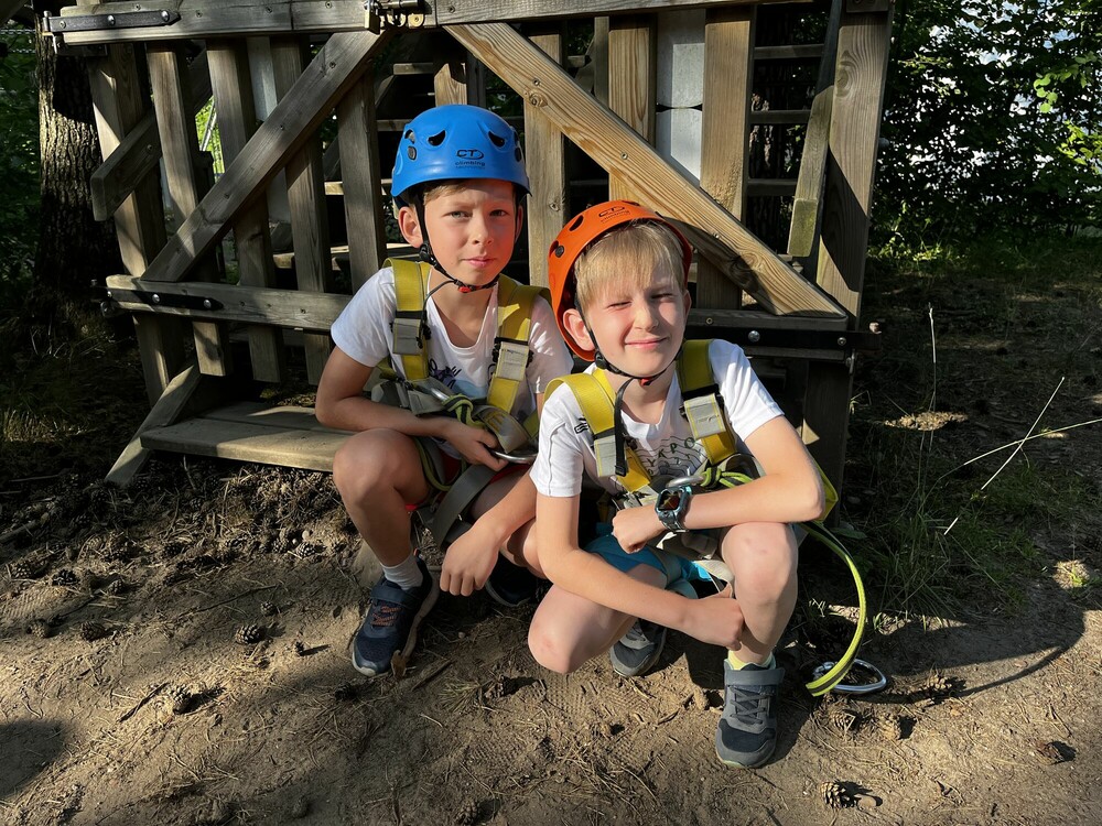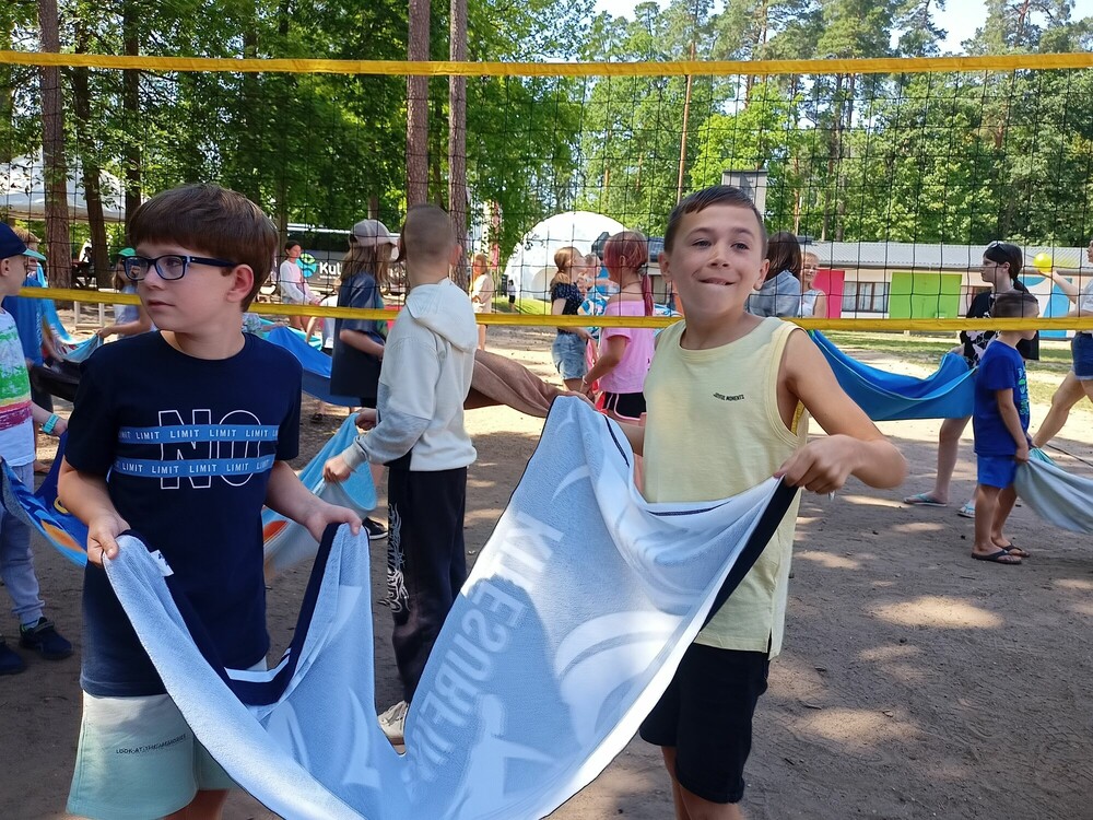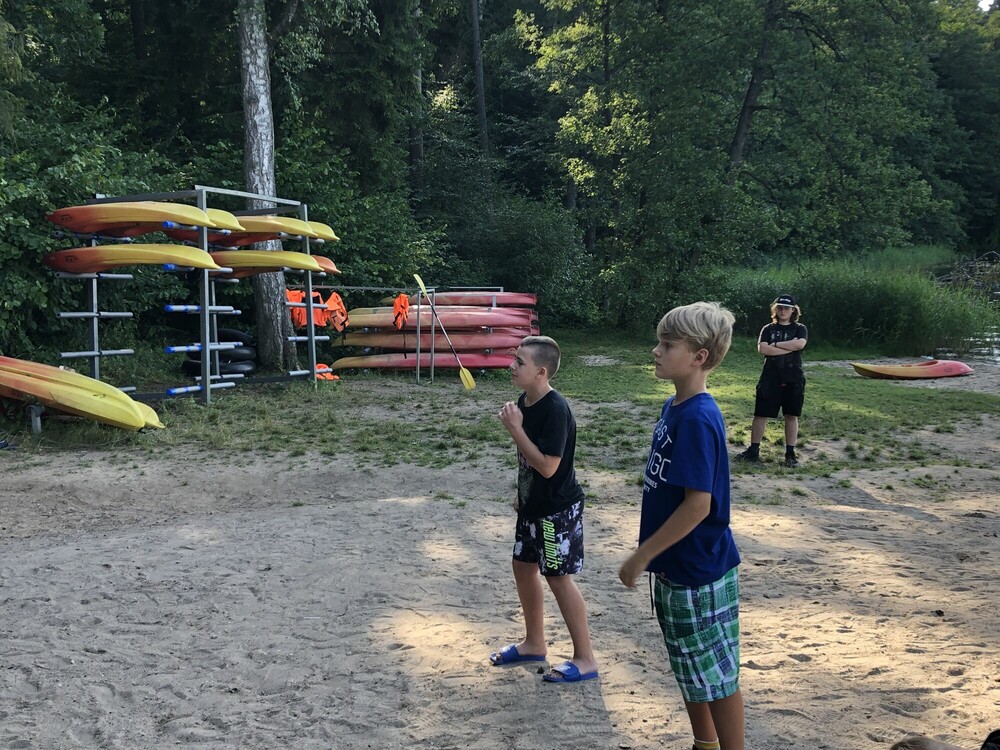 Dziś rano wybraliśmy się na spływ kajakowy po jeziorze Łęsk. Płynęliśmy dwuosobowymi kajakami turystycznymi. Następnie skakaliśmy na eurobungee oraz na trampolinie. Po obiedzie poszliśmy na plażę, gdzie opalaliśmy się, odbijaliśmy piłkę i pływaliśmy. Kolejną atrakcją, z jakiej dziś skorzystaliśmy, było wspinanie się na wieżę ze skrzynek. Wieczorem udaliśmy się do lasu na nocną grę terenową Mafia, podczas której rozwiązywaliśmy zagadki.
