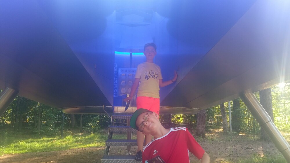 Dzień spędziliśmy poza ośrodkiem, gdyż od razu po śniadaniu ruszyliśmy na wycieczkę naszym autokarem z kosmicznym wyglądem. Na trasie ufobusa znalazły się piękne Mikołajki. Zwiedziliśmy nowe miejsca i wróciliśmy do ośrodka na pyszny obiad. Po południu korzystaliśmy ze słonecznej pogody kąpiąc się w jeziorze Łęsk i odpoczywając na plaży. Wieczorem rozsiedliśmy się wygodnie na sali z ogromnym ekranem sferycznym i obejrzeliśmy seans filmowy. Nie możemy się doczekać kolejnych atrakcji na naszych koloniach.