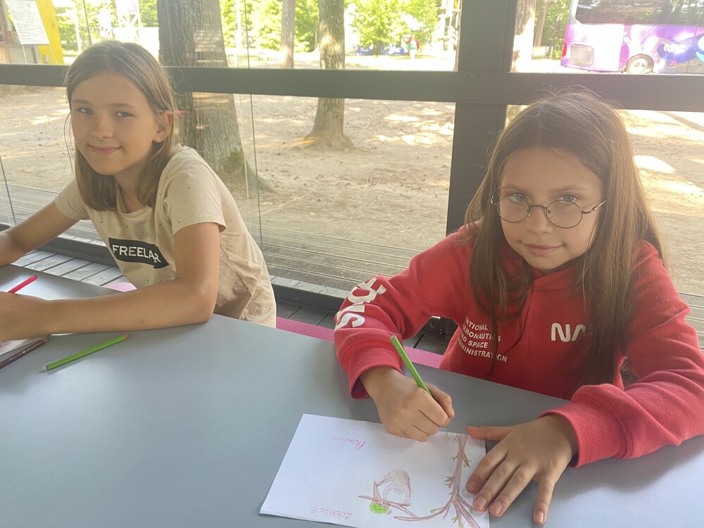 Dzisiaj wsiedliśmy do kosmicznego autokaru. Zawiózł nas do miejsca, w którym odkryliśmy miejsca związane z kosmitami. Konkretnie z jednym, który został zahibernowany lata temu. Budzi się co kilkanaście lat i zwiedza świat. Dzięki temu mogliśmy odwiedzić te same miejsca, znajdujące się w Mikołajkach. Wszystkie wspomnienia uwieczniliśmy na zdjęciach. Po powrocie do ośrodka odwiedziliśmy piaszczystą plażę oraz skorzystaliśmy z możliwości wejścia do wody. Wieczorem wspólnie spędziliśmy czas przy ognisku. Upieczone przez nas kiełbaski były bardzo smaczne.