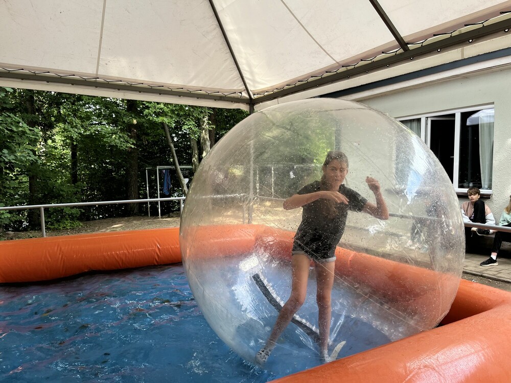 Dzień jak zawsze spędziliśmy na całego. Rozpoczęliśmy od rozegrania meczu piłki nożnej, lecz nie takiego zwykłego, ponieważ był w tunikach zasłaniających nam widok na piłkę. Następnie udaliśmy się na żyroskop, czyli maszynę symulującą stan nieważkości podczas lotu kosmicznego. Kolejną naszą atrakcją był waterball, czyli wielka dmuchana kula w basenie. Na koniec dnia odbył się apel końcowy. To były naprawdę udane wakacje, pełne emocji i z pewnością wrócimy tu za rok!