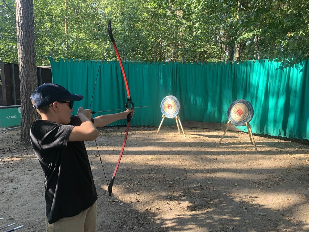 Poranek rozpoczęliśmy od lekcji survivalu. W tym celu udaliśmy się do lasu, gdzie uczyliśmy się sztuki przetrwania, np. budowy szałasu, stworzenia miejsca na ognisko. Dowiedzieliśmy się również, jak wyznaczać kierunki świata bez użycia kompasu. Następnie udaliśmy się na plażę, by rozegrać emocjonujący mecz waterpolo w jeziorze. Kolejną atrakcją dzisiejszego dnia było szkolenie umiejętności prawidłowego strzelania z łuku. Dzień zakończyliśmy grami oraz zabawami integracyjnymi.
