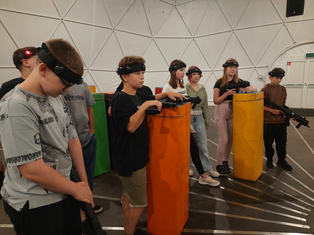 Dzień rozpoczęliśmy od rekreacyjnej wyprawy rowerami wodnymi po jeziorze Łęsk. Następnie zmierzyliśmy się w potyczkach ze świetlną bronią i detektorami trafień. Nauczyliśmy się wyznaczać azymut przy użyciu kompasu. Umiejętność tę wykorzystaliśmy w grze terenowej. Przekroczyliśmy także bramę tajnej bazy, weszliśmy do kokpitu spodka, zobaczyliśmy film o historii UFO na Mazurach. Osiągnęliśmy najwyższy stopień wtajemniczenia. Nauczyliśmy się także strzelać z łuku do tarczy. Był to dzień pełen ciekawych atrakcji i świetnej zabawy.