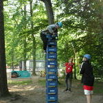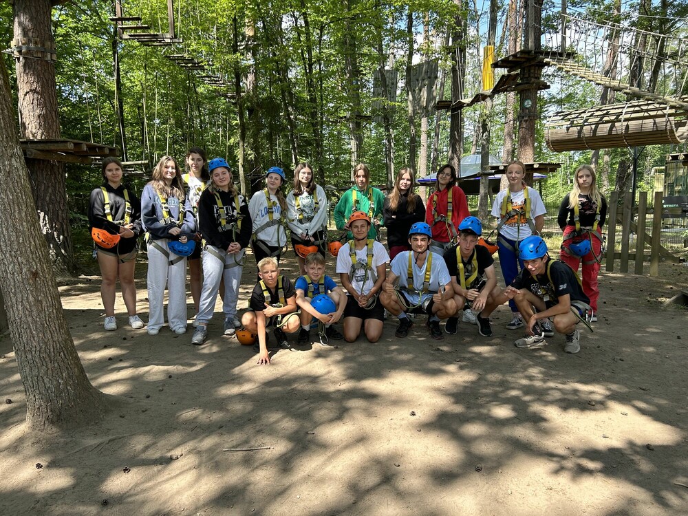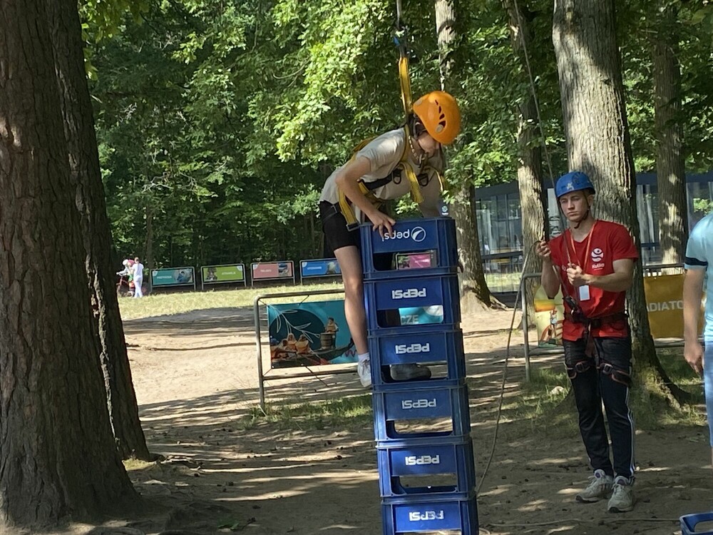 Dzień minął nam na sportowo. Rozpoczęliśmy go przyjemnym przepływem kajakami jednoosobowymi w pięknym słońcu. Stanęliśmy też do emocjonujących walk gladiatorów. Wzięliśmy udział w Akcji Integracji, podczas której staliśmy się zwartą grupą! Pokonaliśmy również bez trudności oba poziomy parku linowego.