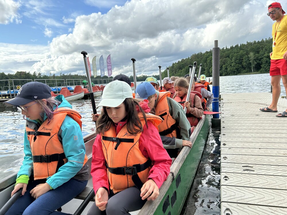 Dzień rozpoczęliśmy od malowania plakatów. Następnie graliśmy na magicznych dywanach oraz poznawaliśmy podstawy survivalu. Wybraliśmy się również nad jezioro, gdzie płynęliśmy smoczą łodzią. Dzień skończyliśmy ogniskiem