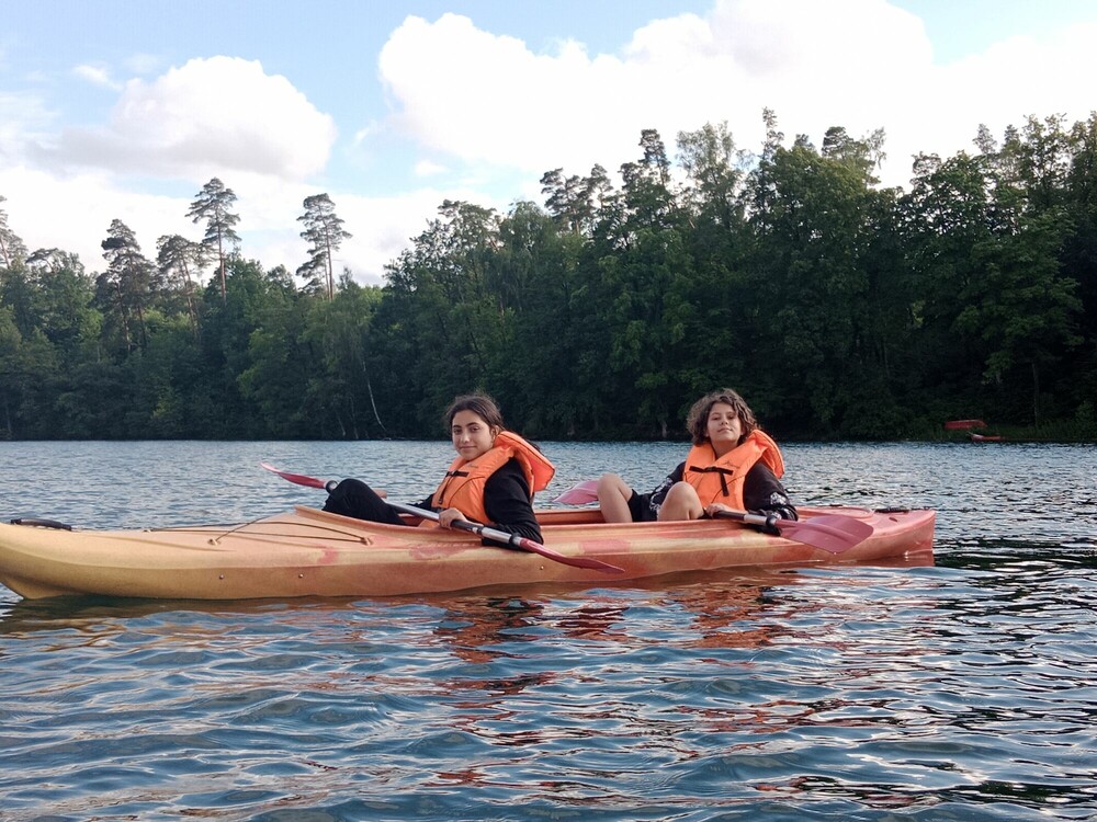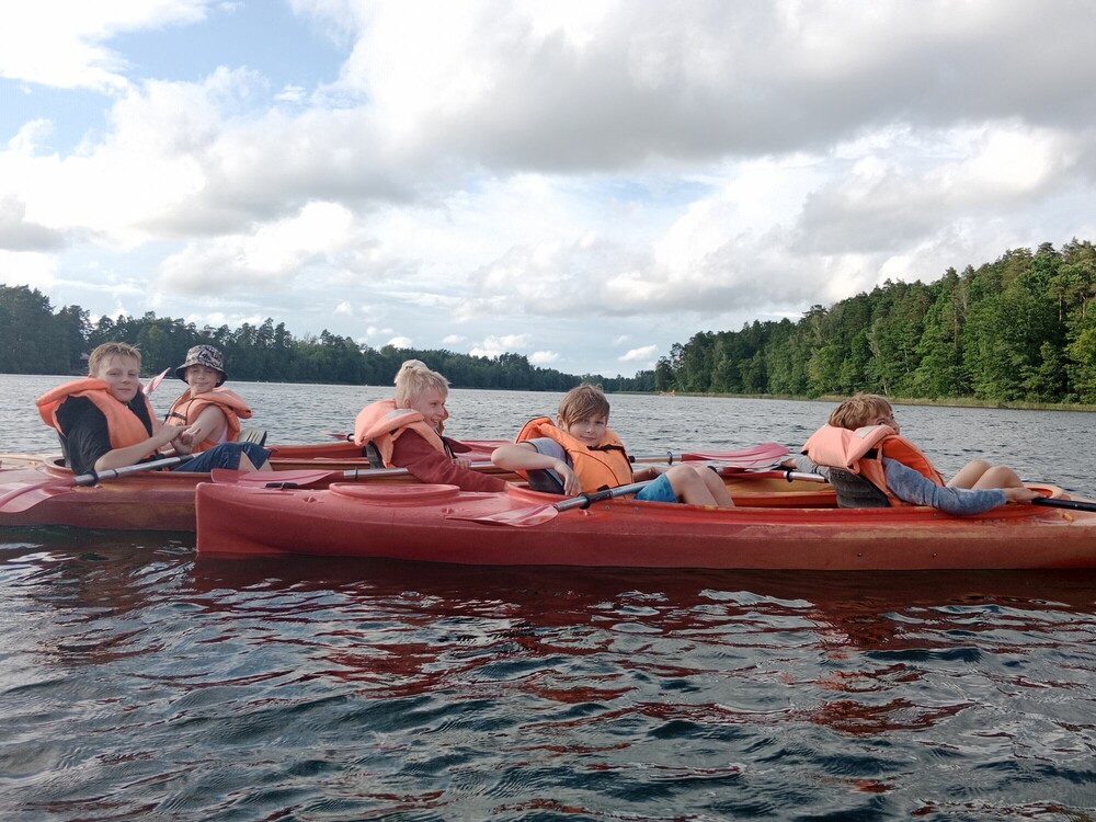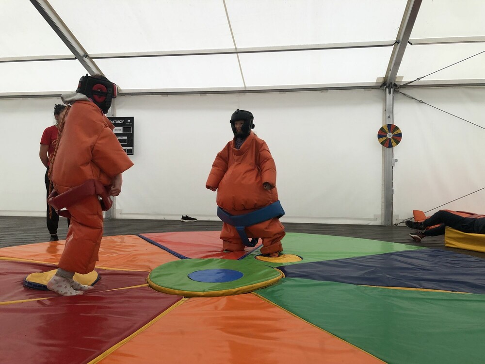Dzień rozpoczął się pod deszczowym znakiem zapytania, ale korzystając z zadaszonego namiotu zorganizowaliśmy emocjonujące walki sumo. Potem graliśmy w głuchy telefon. Gdy całkiem się rozpogodziło, pływaliśmy na bezburtowych kajakach sit on top.
