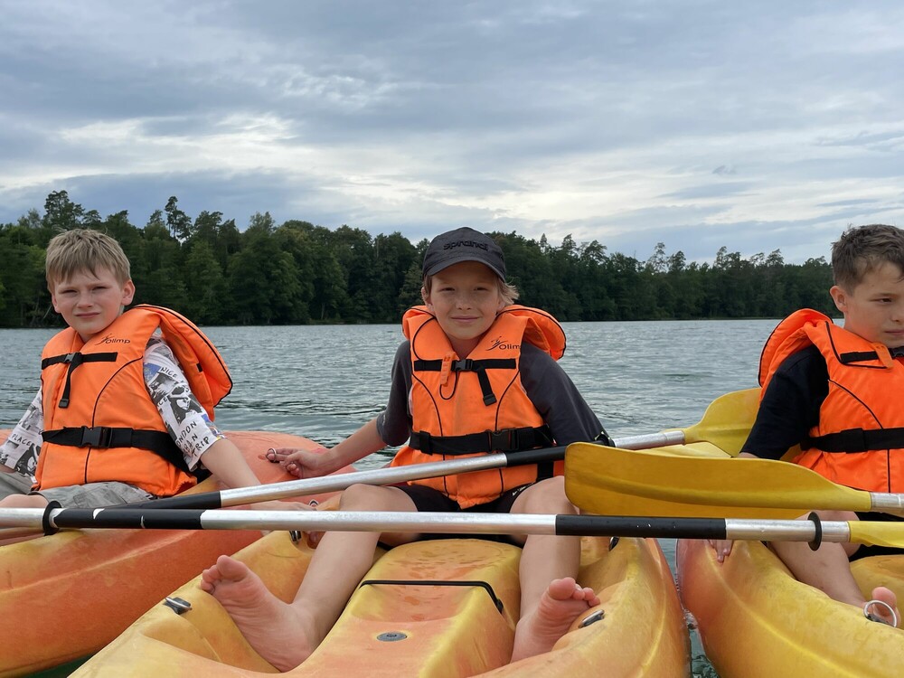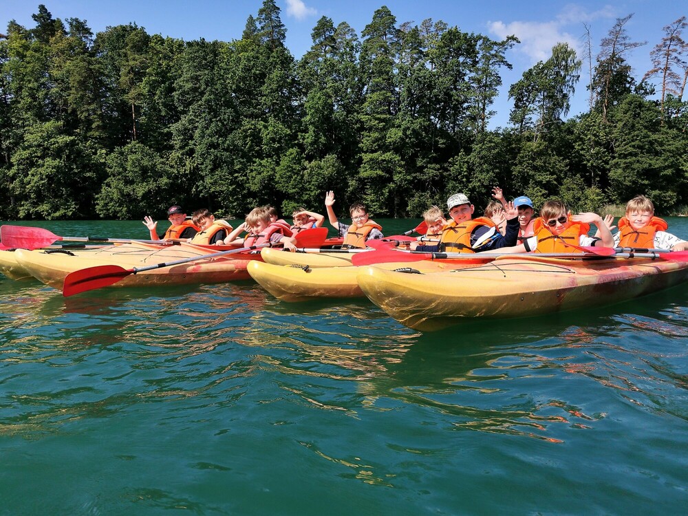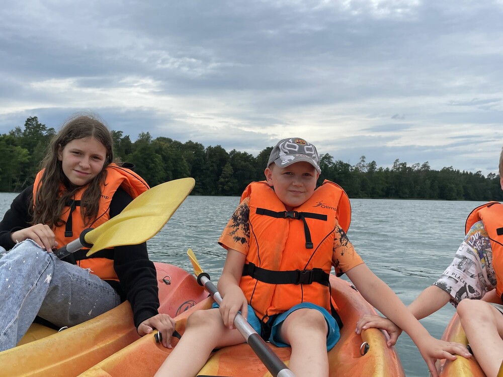 Dziś dużo atrakcji dostarczył nam żyroskop, pozwalający poczuć się jak przy starcie rakiety kosmicznej. Aż nam się zakręciło w głowach. Grałyśmy również w podchody i oglądałyśmy kolonijny Talent Show. Przed kolacją wypłynęłyśmy kajakami na wyprawę po malowniczym jeziorze Łęsk, a dzień zakończyliśmy wspólnym piżama party!