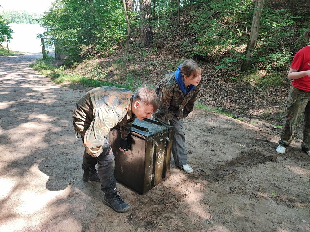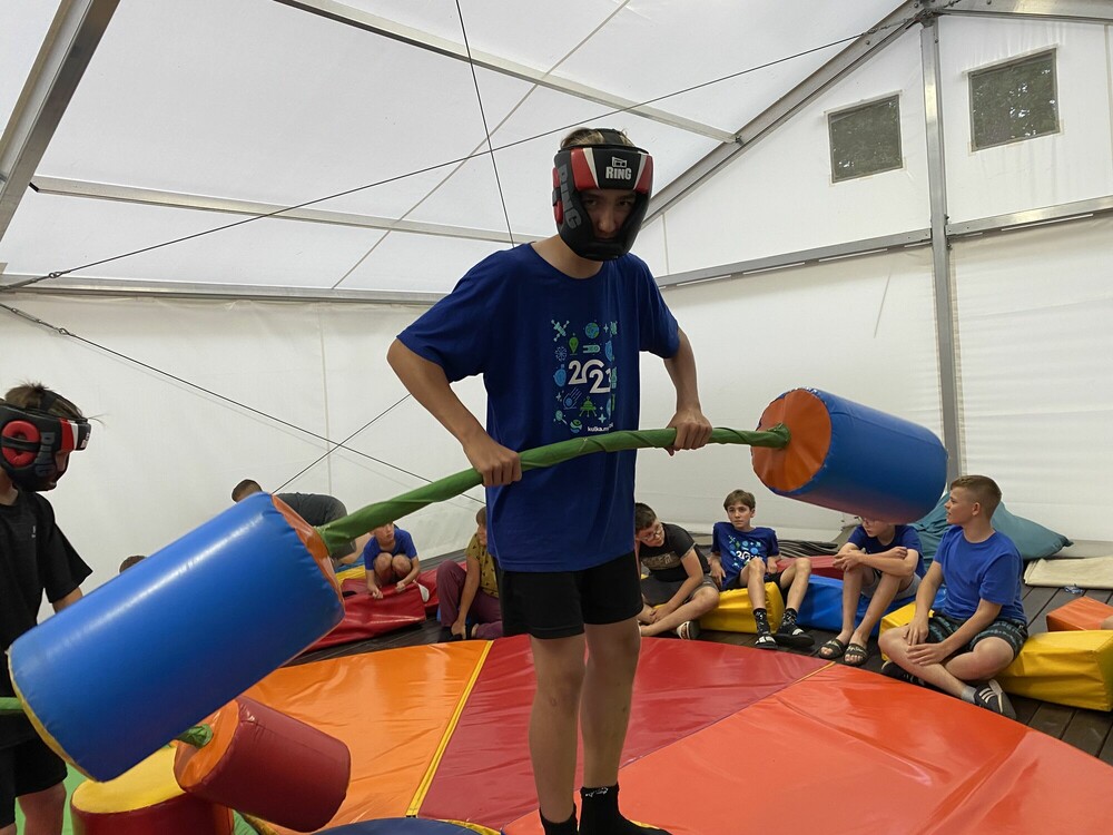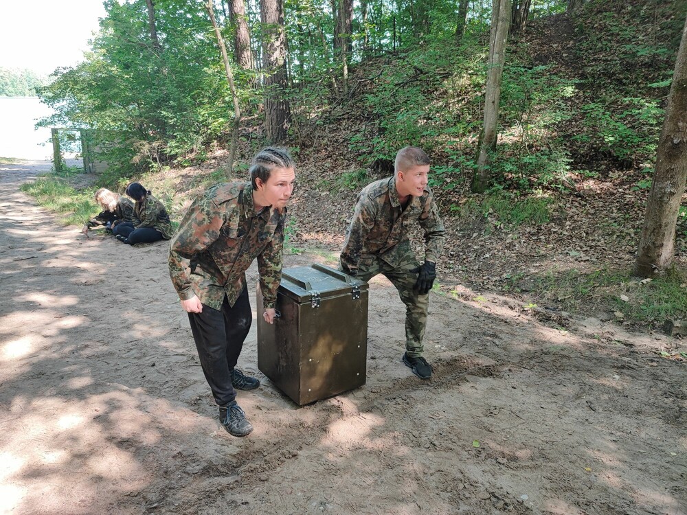 Dzisiejszy ranek rozpoczęliśmy od wspólnych zmagań w Letnim Trójboju Obronnym, w trakcie którego mogliśmy sprawdzić się rzucając granatem, rozstawiając telefony polowe i przenosząc wojskową skrzynię. Później czekał nas turniej gladiatorów - walczyliśmy ze sobą na miękkiej macie w strojach ochronnych, próbując strącić oponenta z podestu przy użyciu lancy. Po obiedzie odpoczywaliśmy na plaży, a następnie spróbowaliśmy swoich sił we wspinaczce na wieżę ze skrzynek. Wieczorem zajęliśmy się tworzeniem naszej obozowej flagi oraz grami integracyjnymi.
